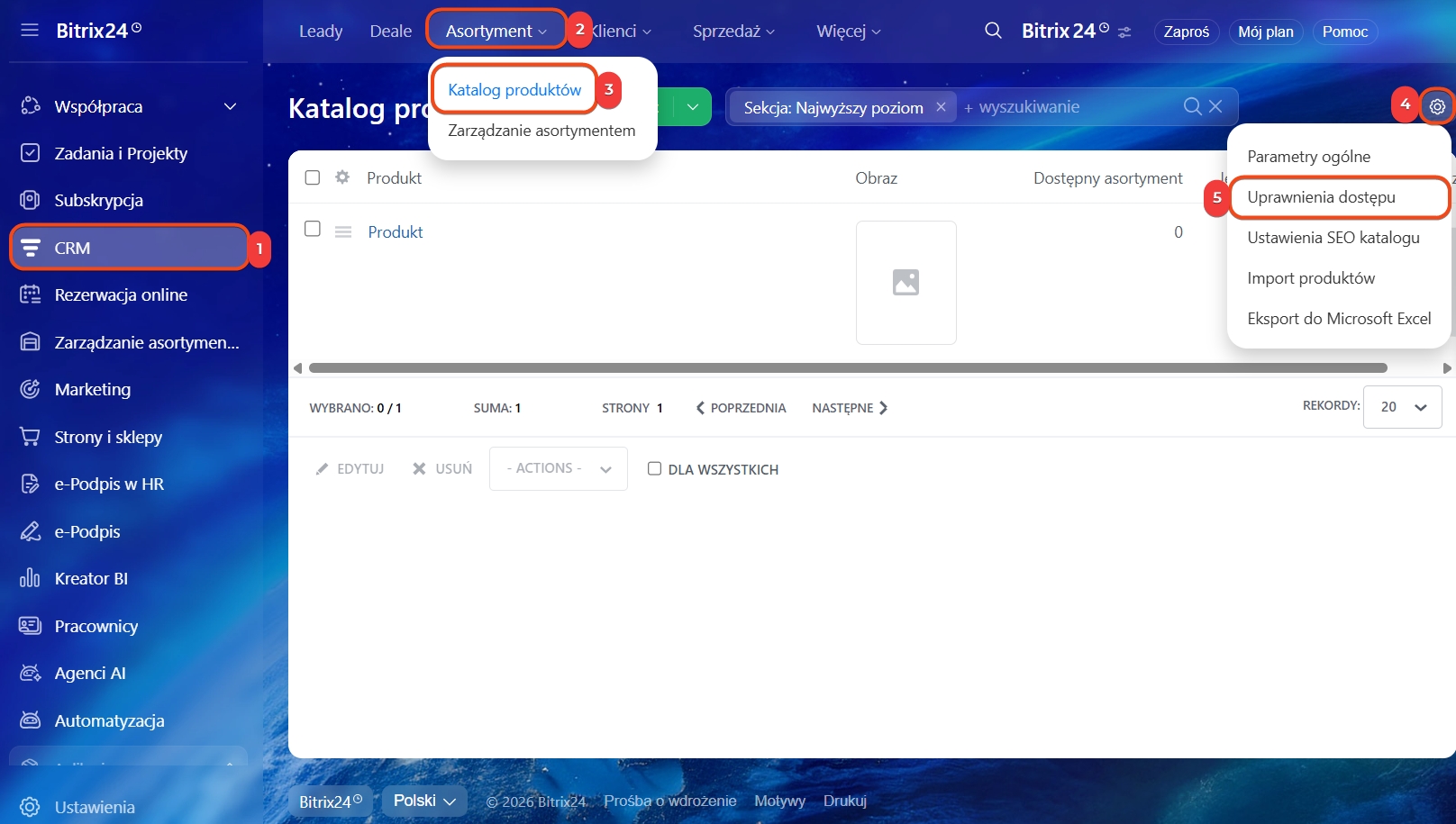 Przejdź do sekcji CRM > Asortyment > Katalog produktów. Kliknij Ustawienia (⚙️) w prawym górnym rogu i wybierz Uprawnienia dostępu.