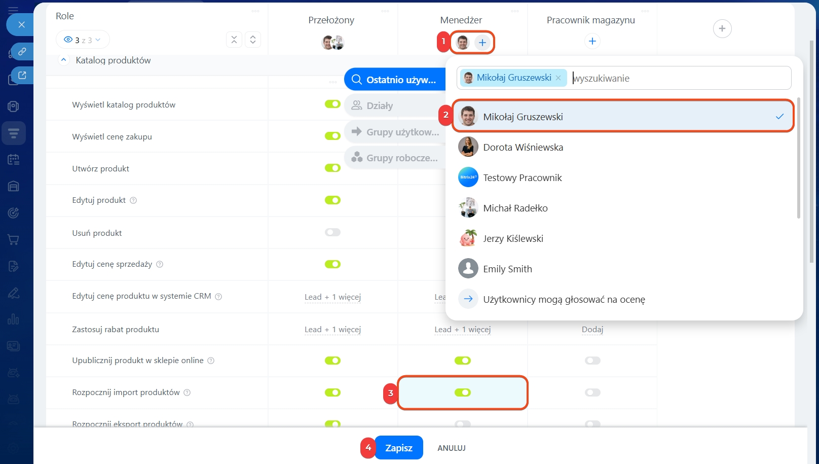- Aby menedżer mógł konfigurować pola w formularzu, przypisz mu rolę z włączonym uprawnieniem Zmiana widoku formularza produktu.
