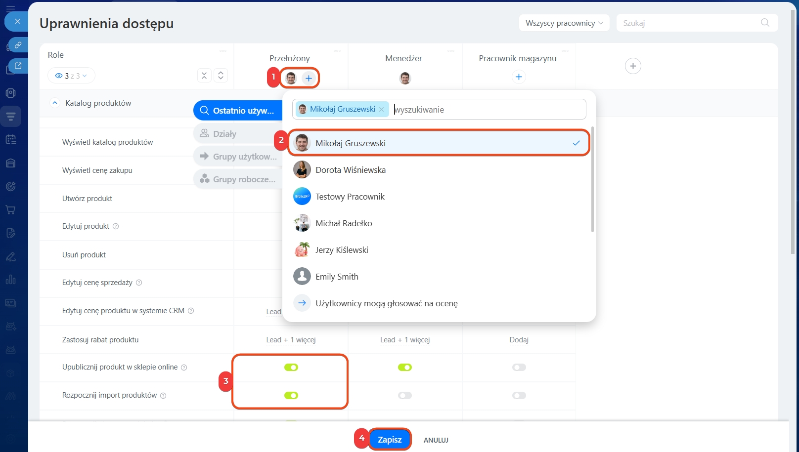 - Aby kierownik mógł ustawić widok formularza dla wszystkich pracowników, przypisz mu rolę z uprawnieniami Zmiana widoku formularza produktu oraz Zastosowanie widoku formularza produktu dla wszystkich.