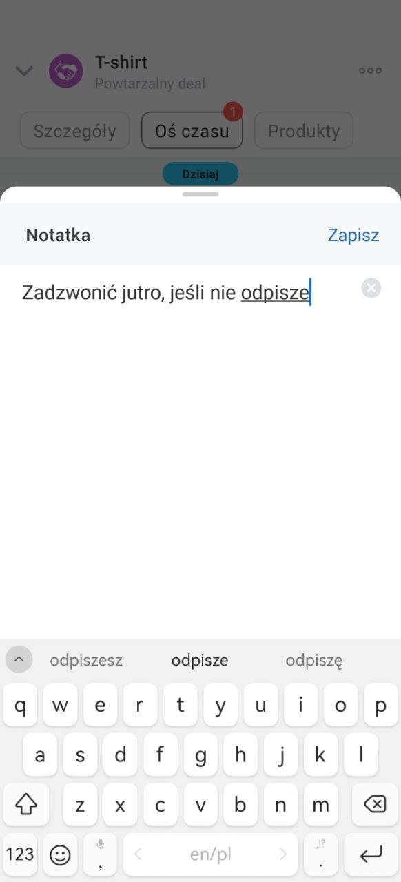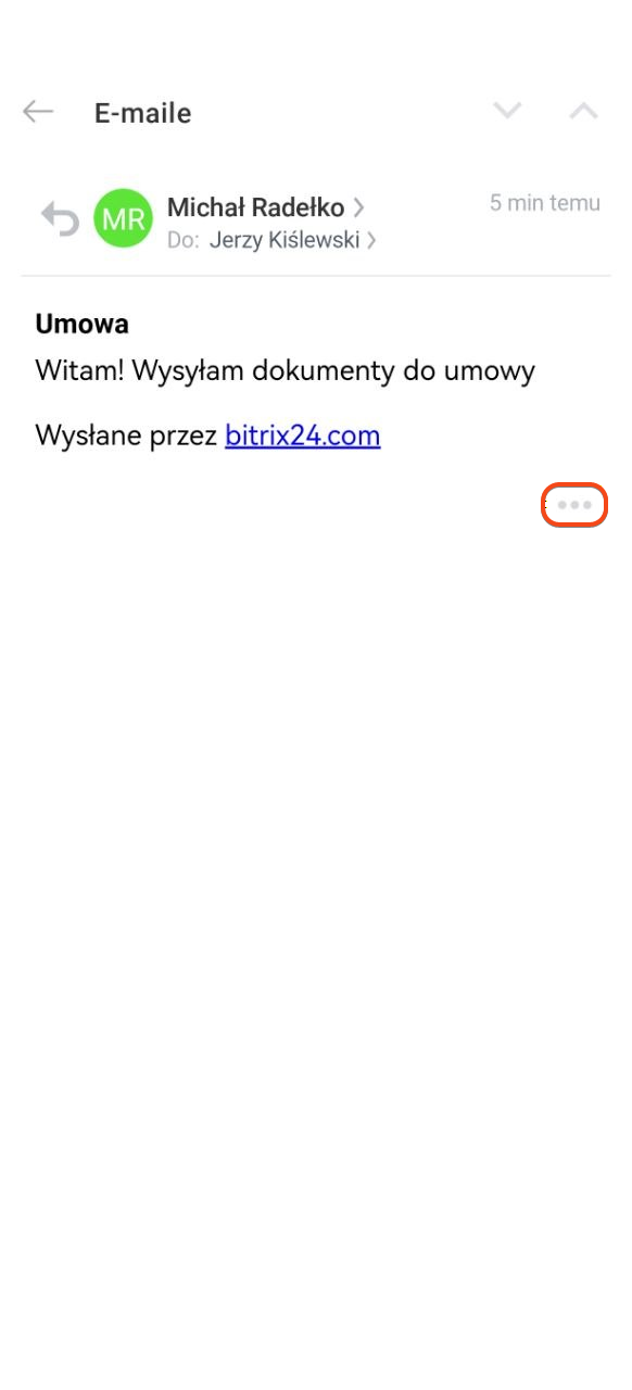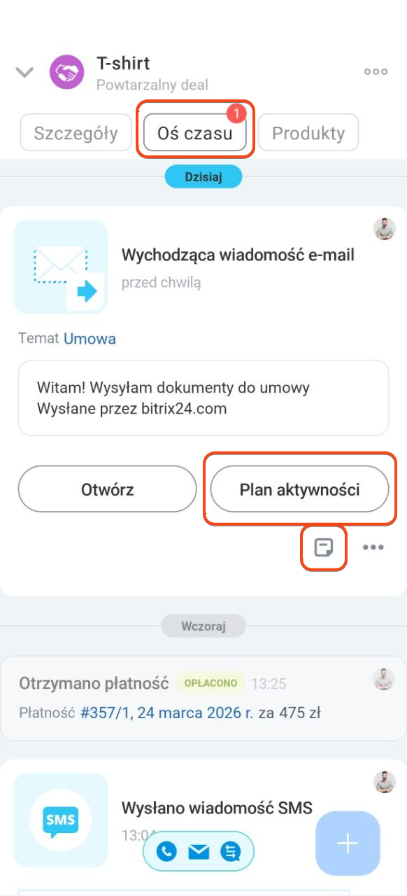 - Do wiadomości możesz dodać notatkę, zaplanować zadanie lub przypiąć ją w formularzu elementu CRM, aby szybko wrócić do ważnej korespondencji.