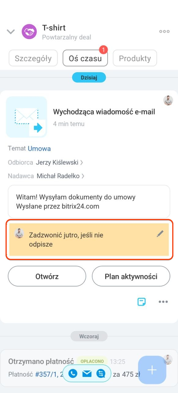 Wiadomości przychodzące i wychodzące możesz przypiąć w formularzu elementu CRM, dodać do nich notatkę lub zadanie. Na przykład po wysłaniu oferty handlowej możesz zaplanować telefon i doprecyzować decyzję klienta.