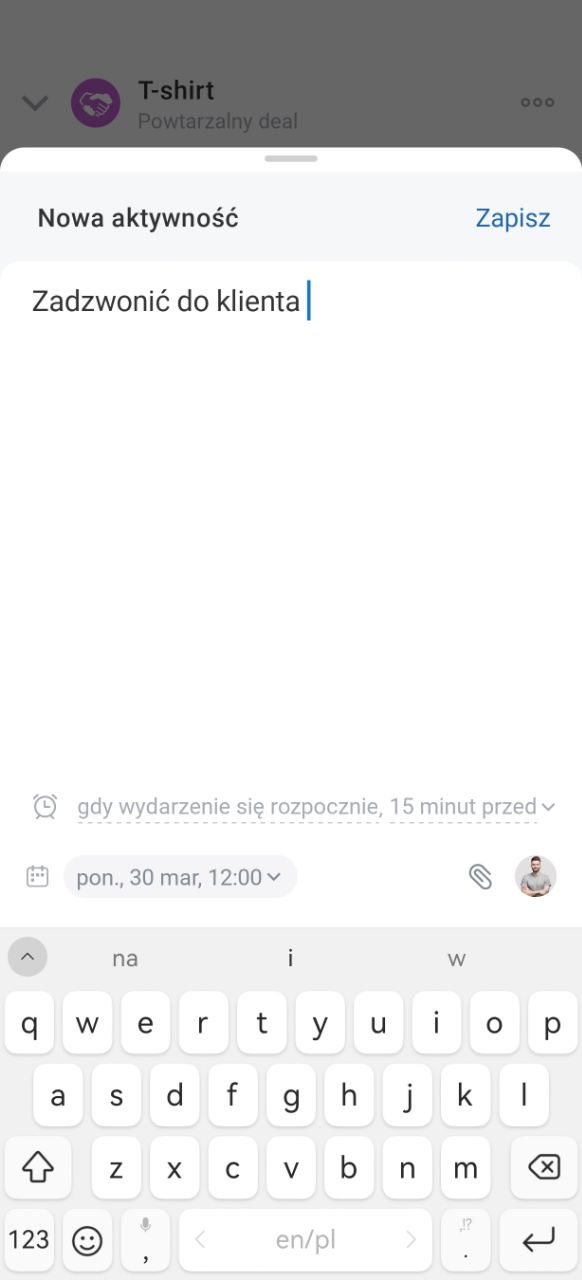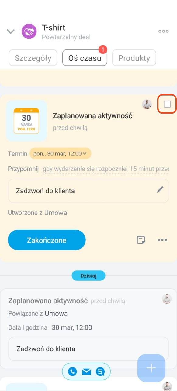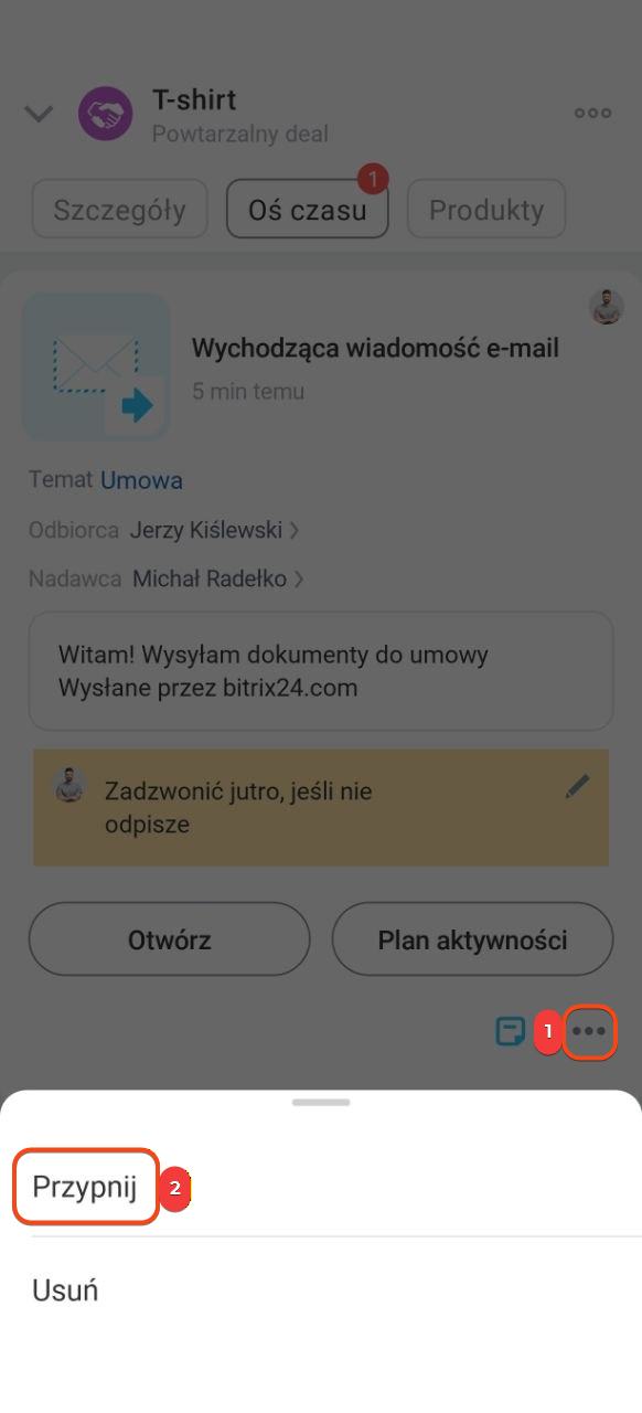 Przypiąć wiadomość lub zadanie w formularzu elementu CRM. Wiadomość lub zadanie możesz przypiąć, aby szybko wrócić do ważnej korespondencji z klientem.