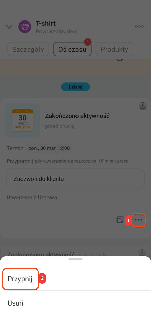 Na osi czasu w zapisie o wiadomości lub zadaniu kliknij Trzy kropki (...) > Przypnij.