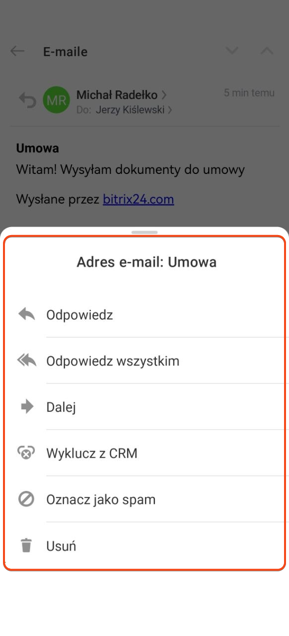 - Na wiadomość przychodzącą możesz odpowiedzieć, przekazać ją dalej, oznaczyć jako spam, wykluczyć z CRM lub usunąć.