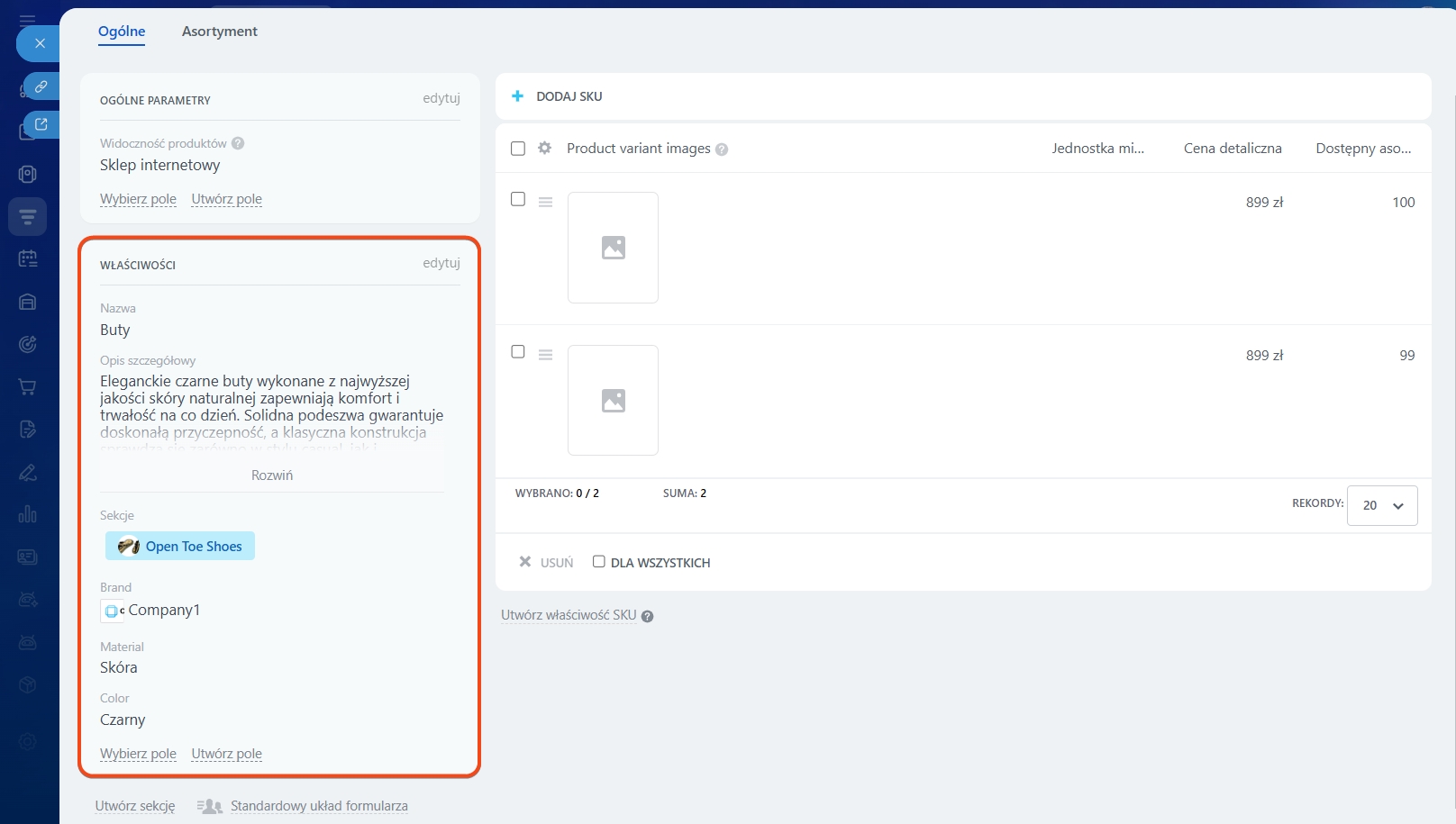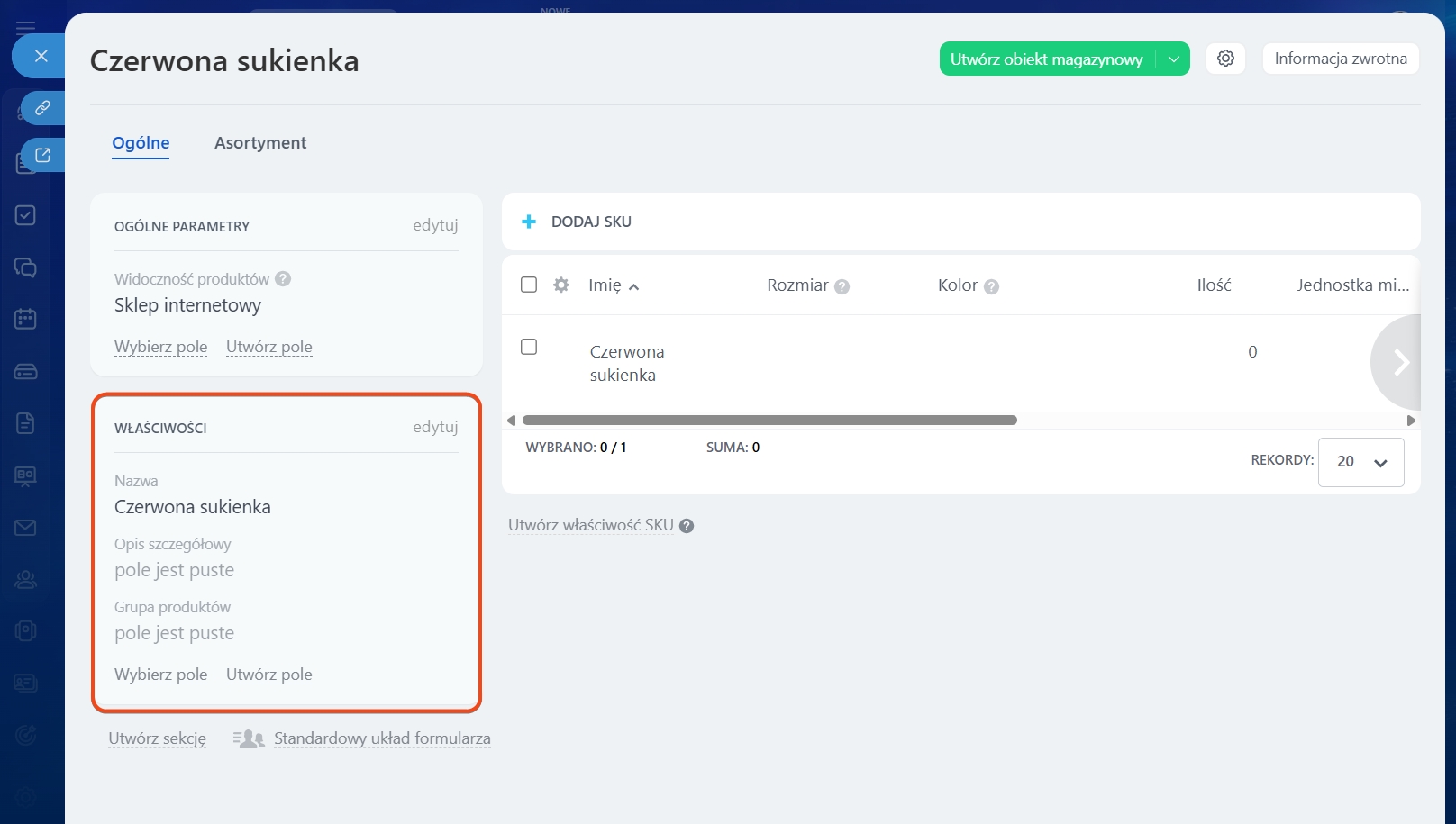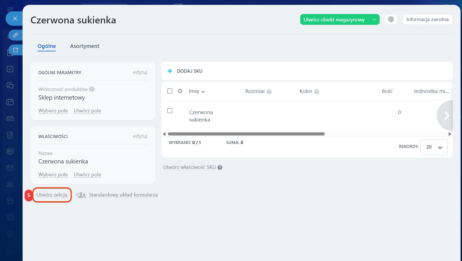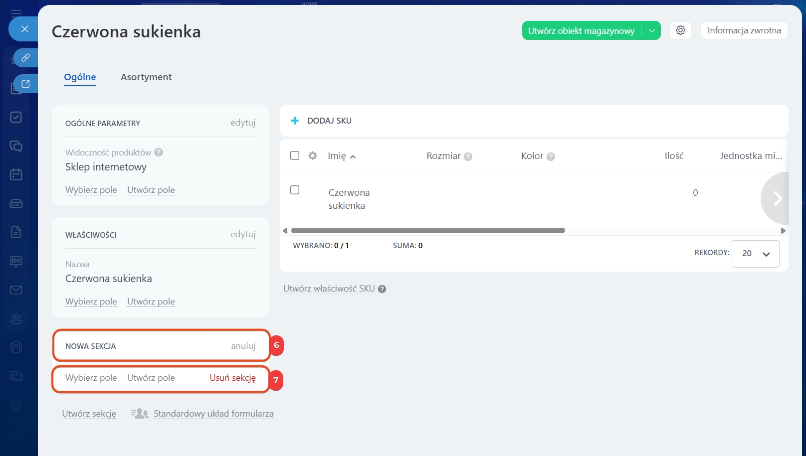 - Właściwości można grupować w sekcje — w karcie produktu kliknij Utwórz sekcję.