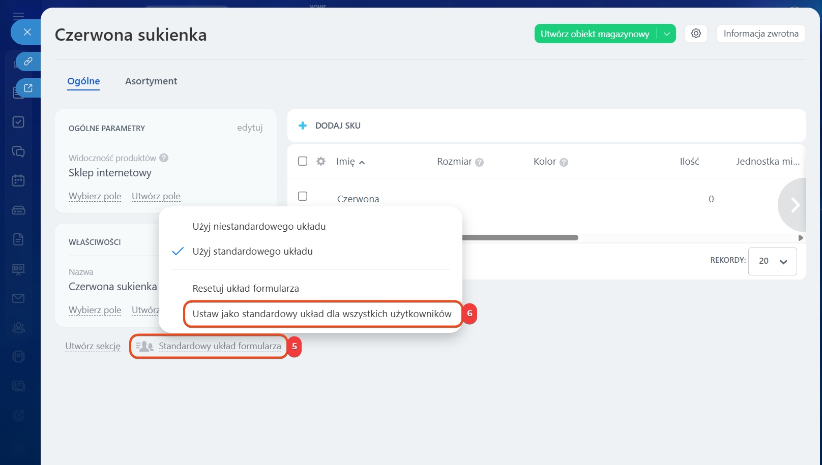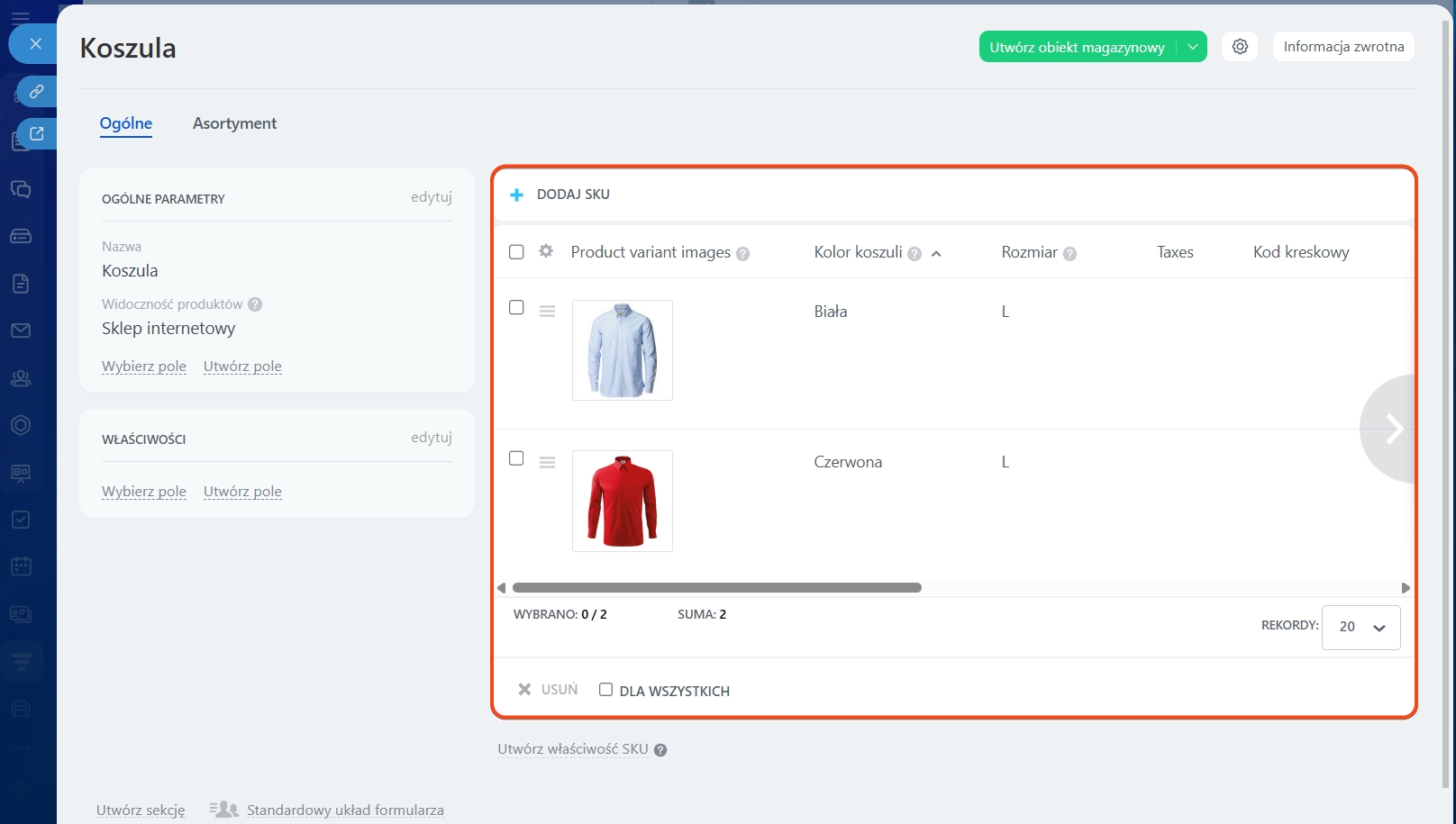 W Bitrix24 właściwości to pola z informacjami o produkcie. Można na przykład dodać pole Materiał lub Typ matrycy. Jeśli produkt występuje w kilku wariantach — na przykład w różnych rozmiarach lub kolorach — użyj wariantów produktu.
