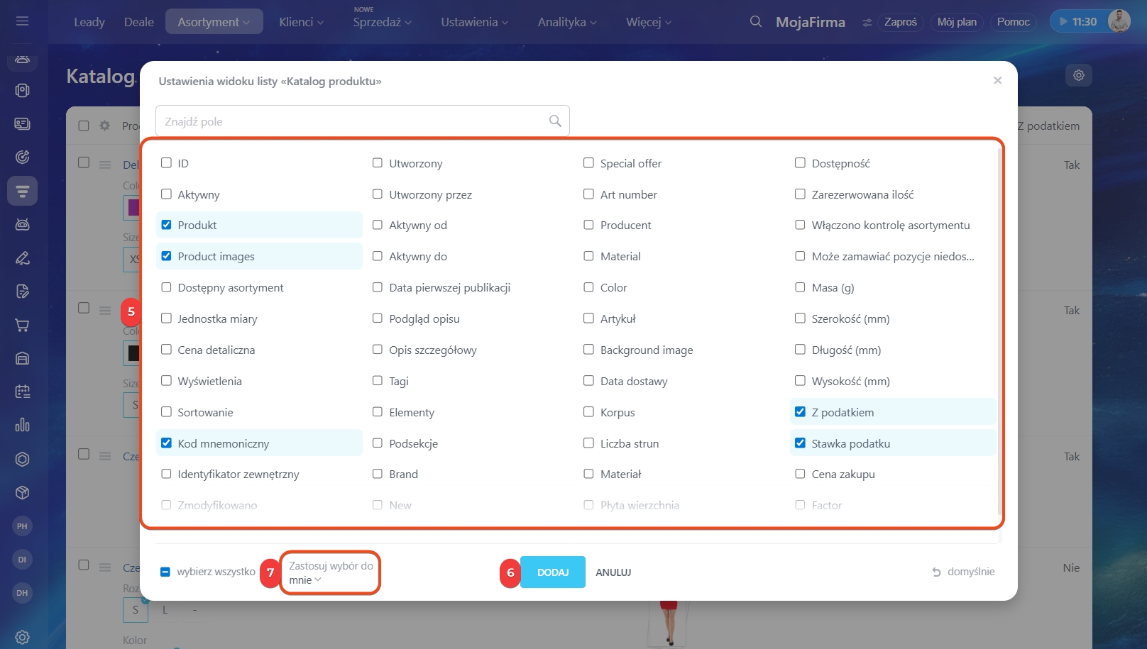 - Aby widzieć właściwości na liście produktów, przejdź do CRM > Asortyment > Katalog produktów, kliknij Ustawienia (⚙️) i wybierz pola.