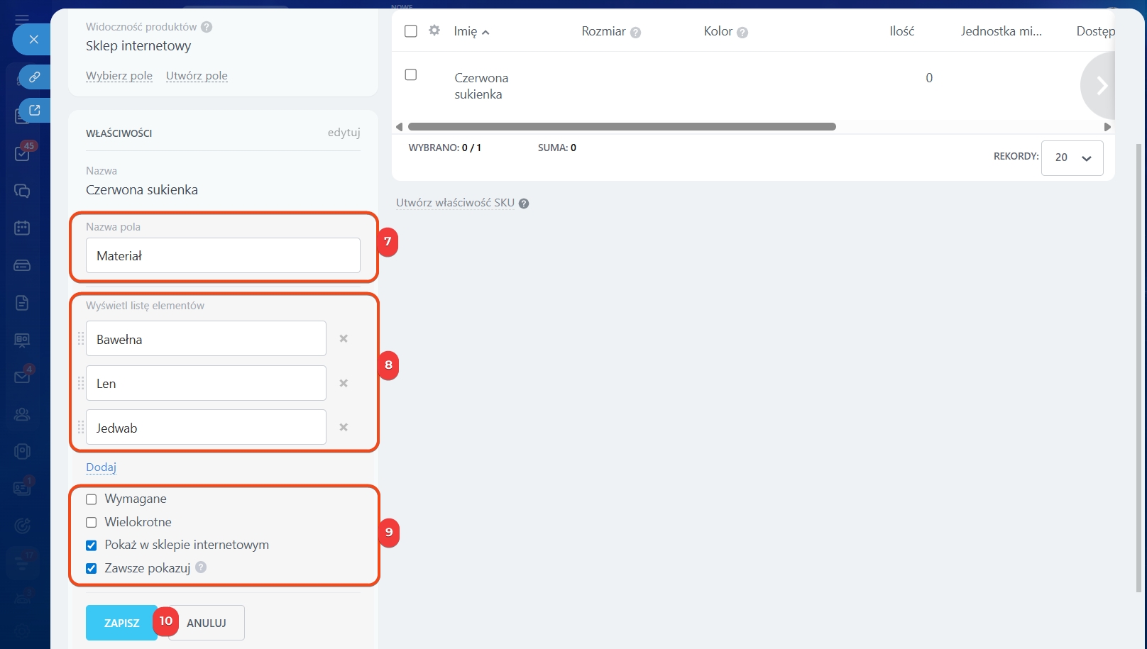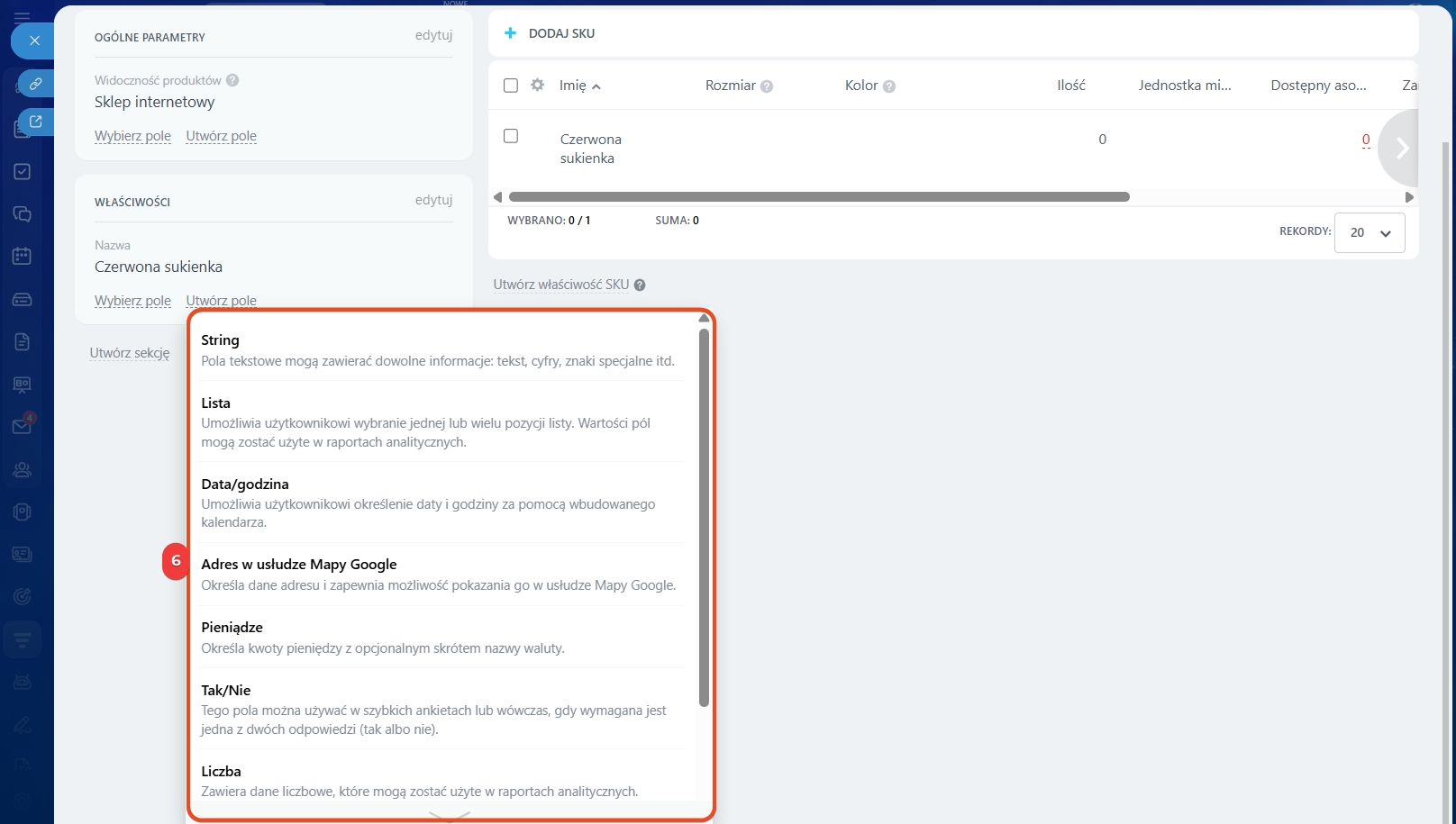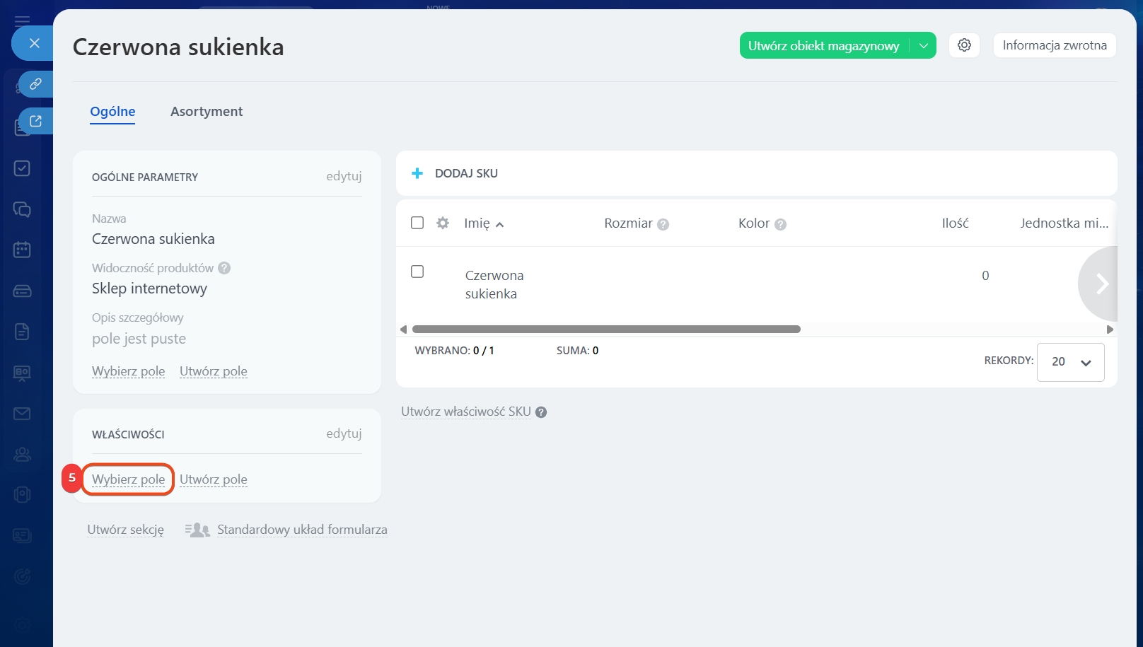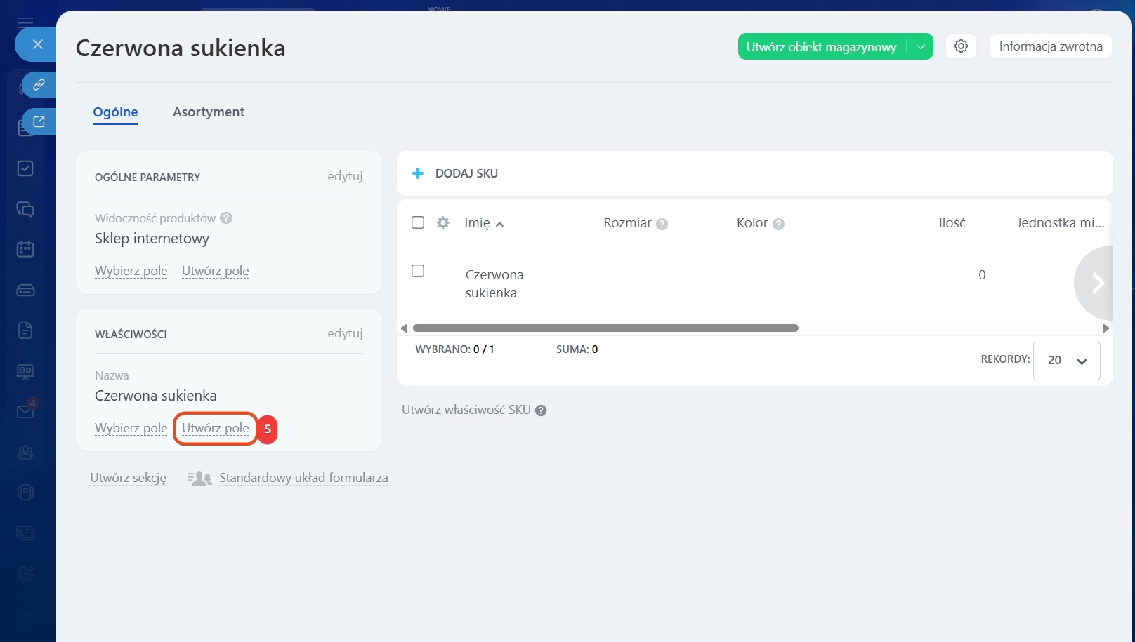 Utworzyć nowe pole. Jeśli potrzebnej właściwości nie ma, można ją dodać — wystarczy utworzyć nowe pole w karcie produktu.