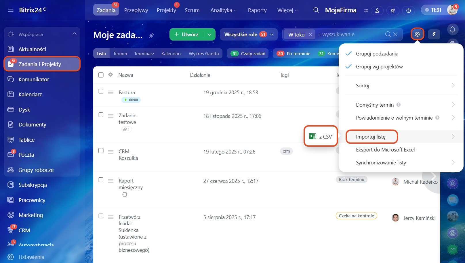 Import umożliwia szybkie przeniesienie dużej listy zadań bez ręcznego wprowadzania danych.