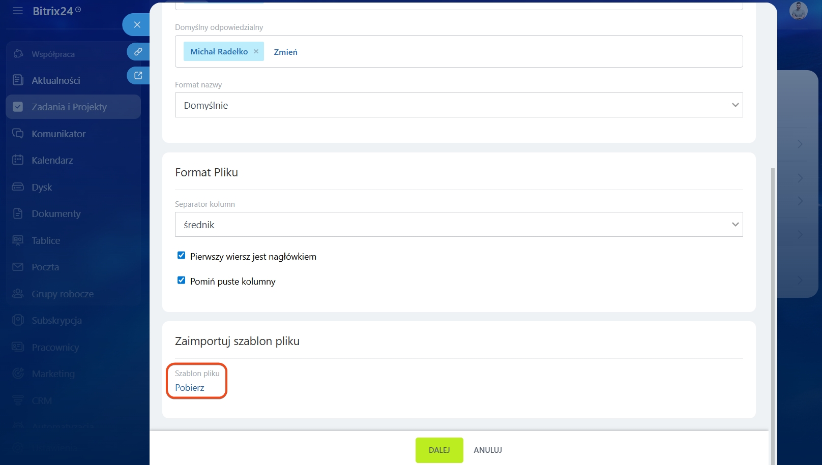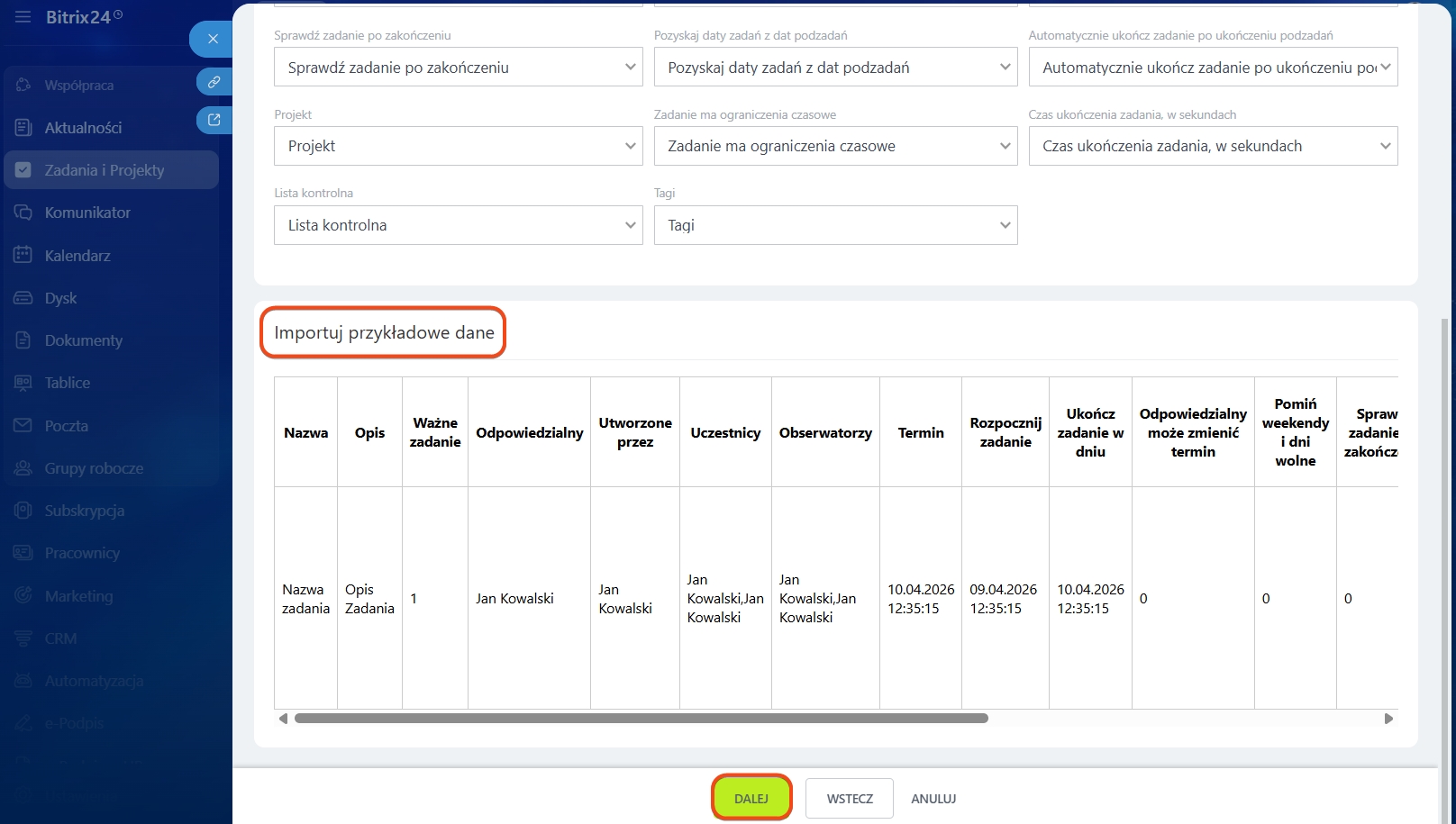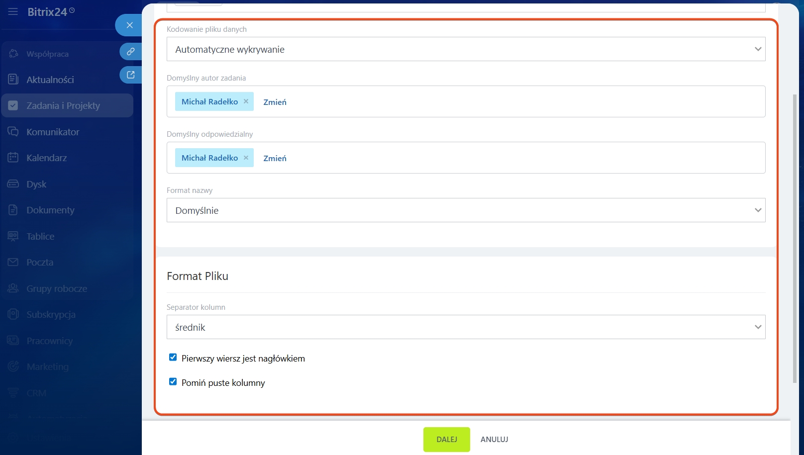 5. Sprawdź, czy pola z pliku pasują do odpowiednich pól w Bitrix24. Na przykład pole Odpowiedzialny z pliku powinno odpowiadać temu samemu polu w karcie zadania.