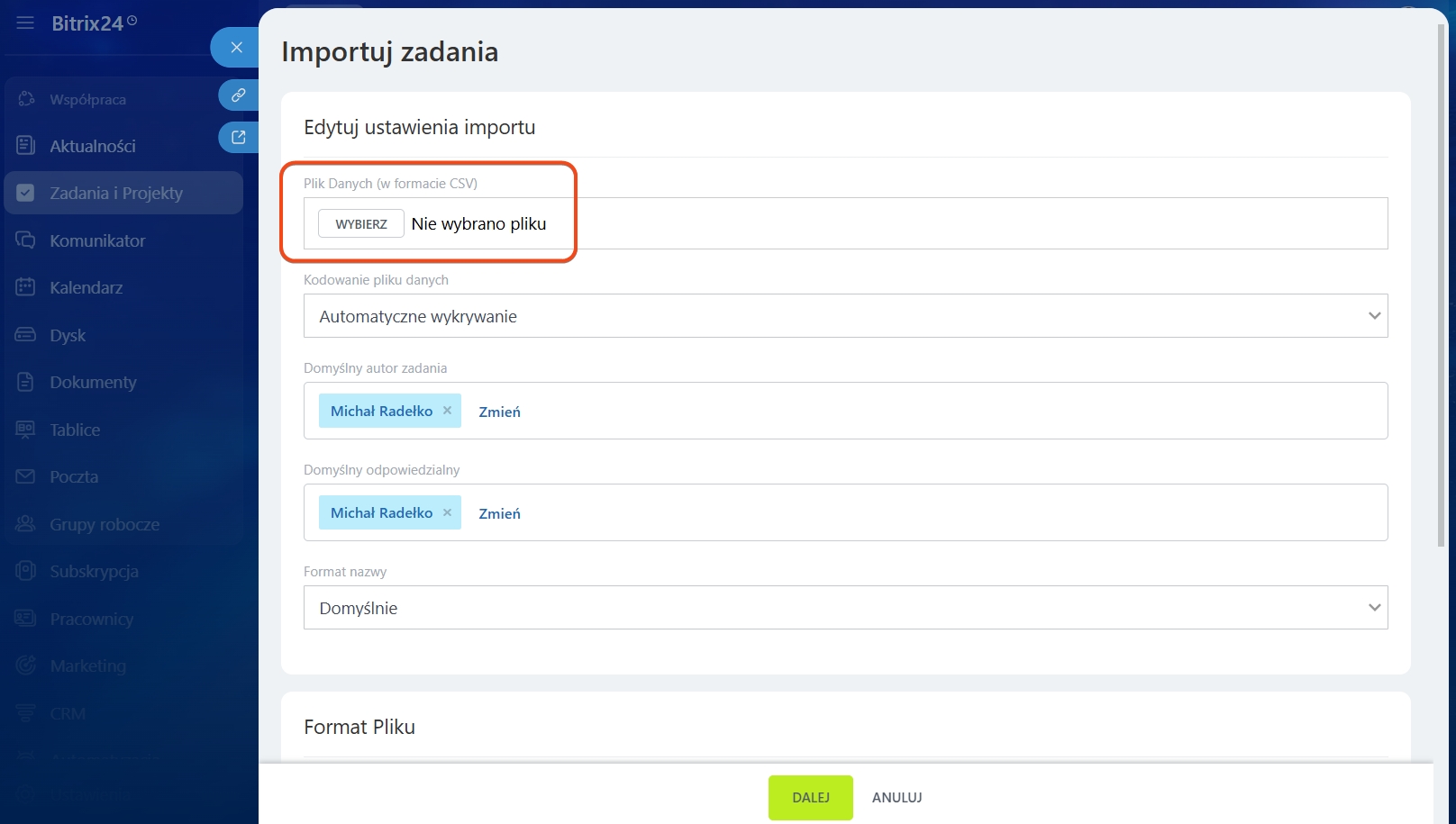 Jeśli eksportowałeś zadania z innego Bitrix24, plik jest już gotowy do zaimportowania. W takim przypadku pomiń przygotowanie pliku i przejdź od razu do kroku Prześlij plik importu.