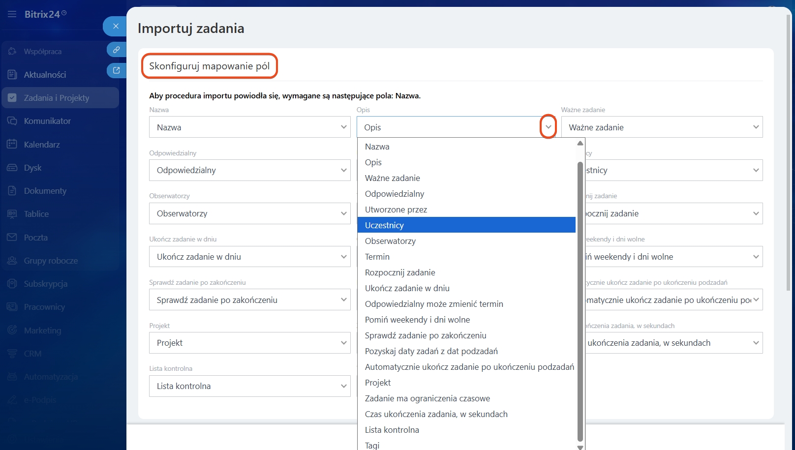 5. Sprawdź zgodność pól. Pola z pliku powinny być poprawnie dopasowane do pól zadania w Bitrix24.
