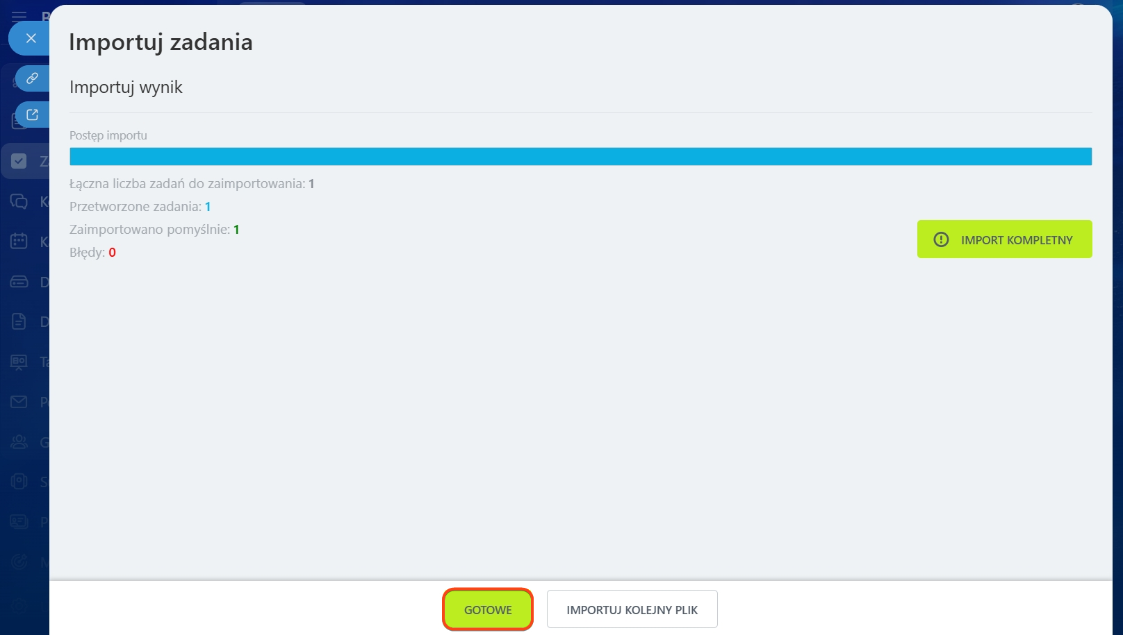 Jeśli wystąpią błędy, zostaną wyświetlone. Im więcej zadań, tym dłużej może potrwać import.