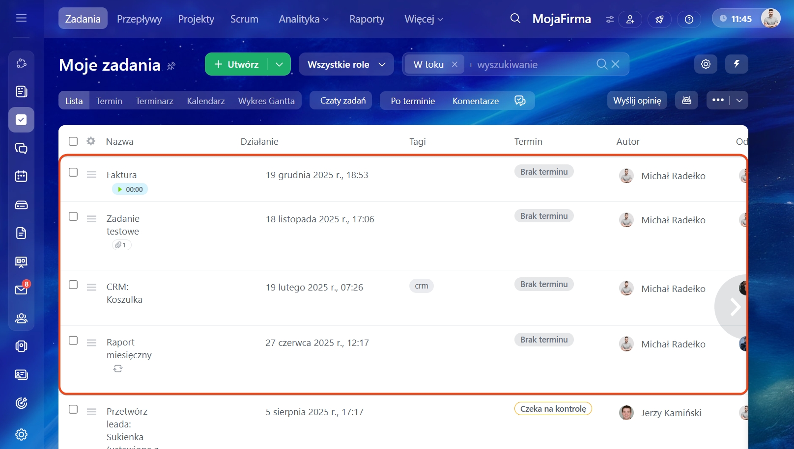 1. Przejdź do sekcji Zadania i projekty i wybierz tryb widoku Lista.