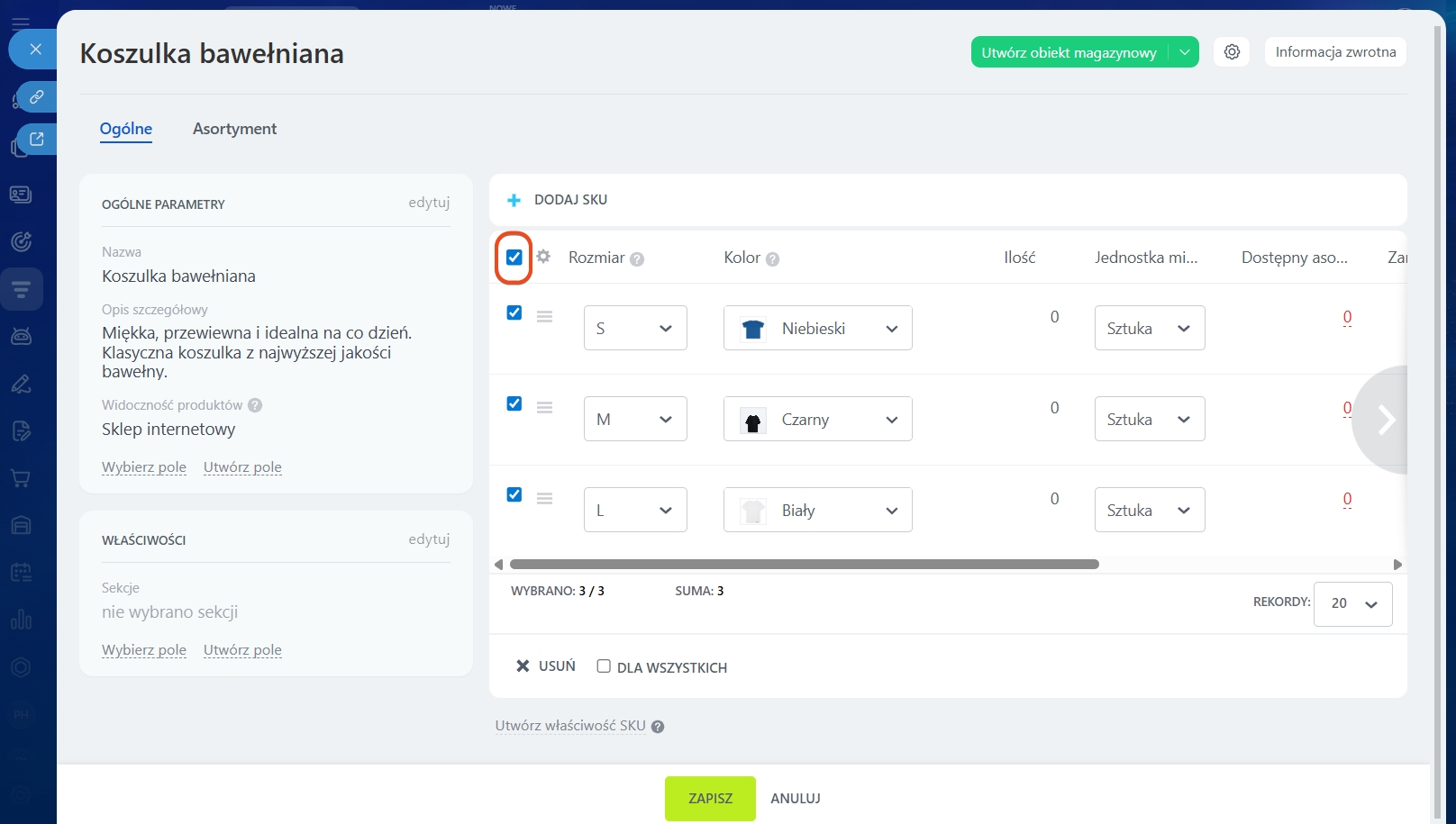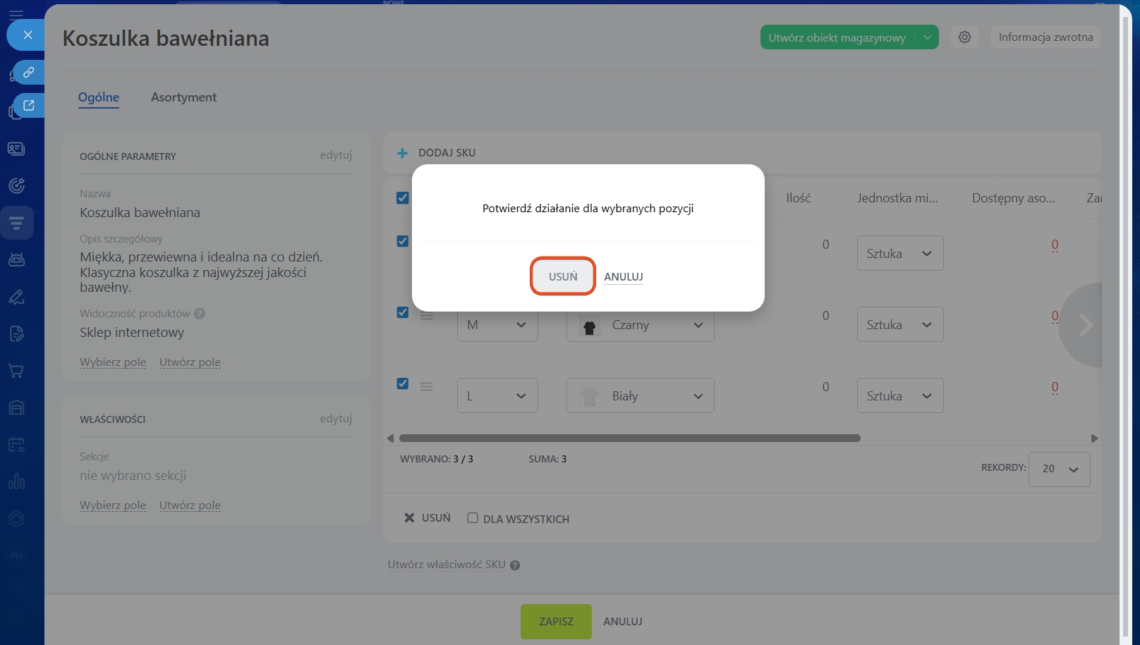 1. Otwórz formularz produktu z wariantami. Zaznacz wszystkie warianty i kliknij Usuń. Potwierdź operację.