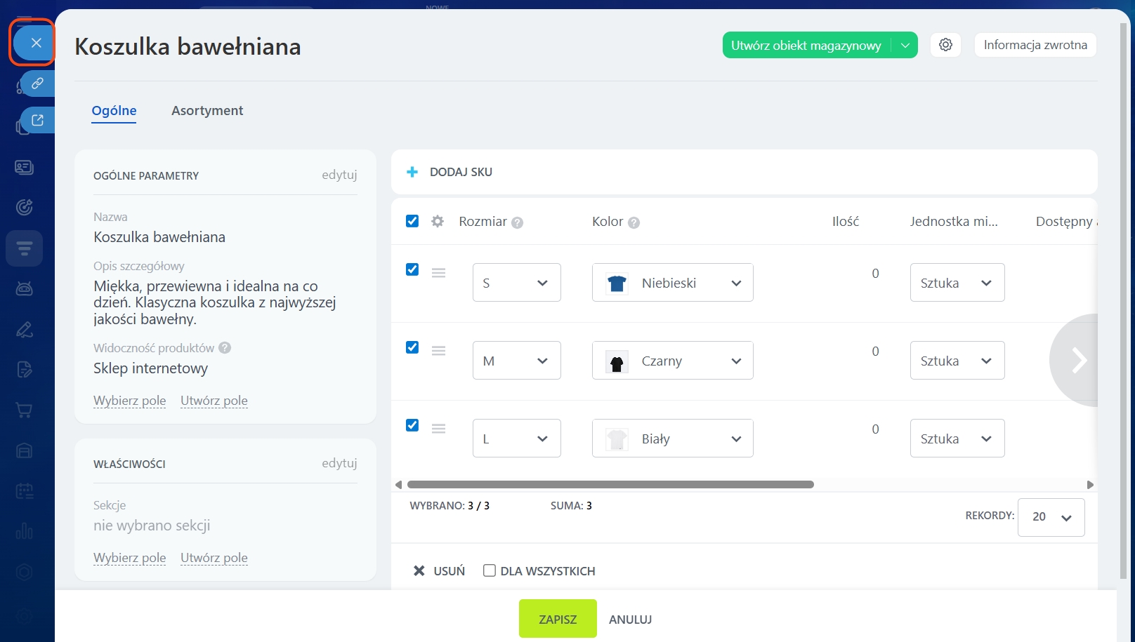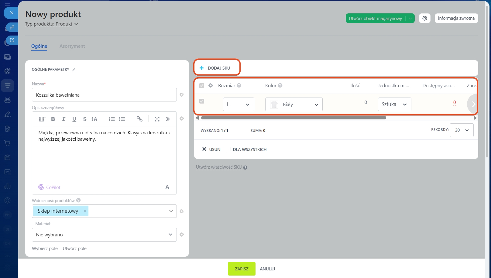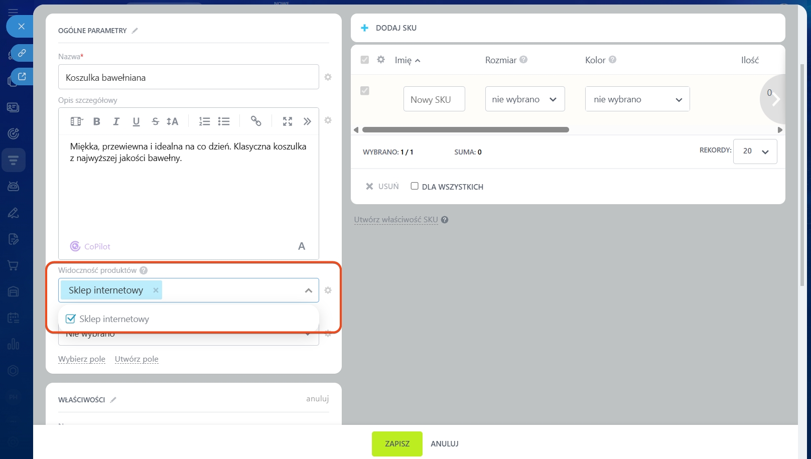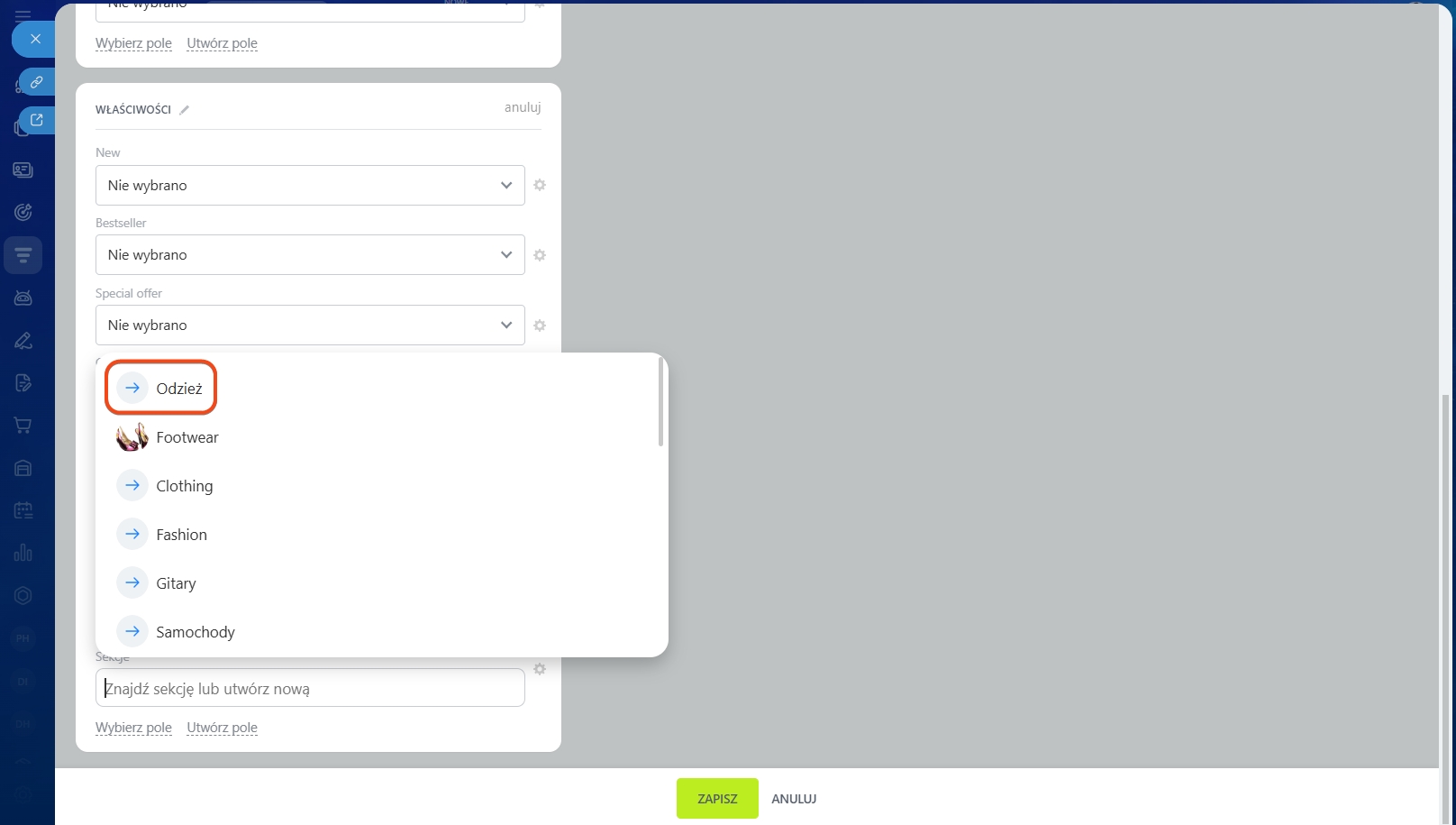 - Przypisz produkt do sekcji i dodaj właściwości, np. kolor, materiał lub producenta.