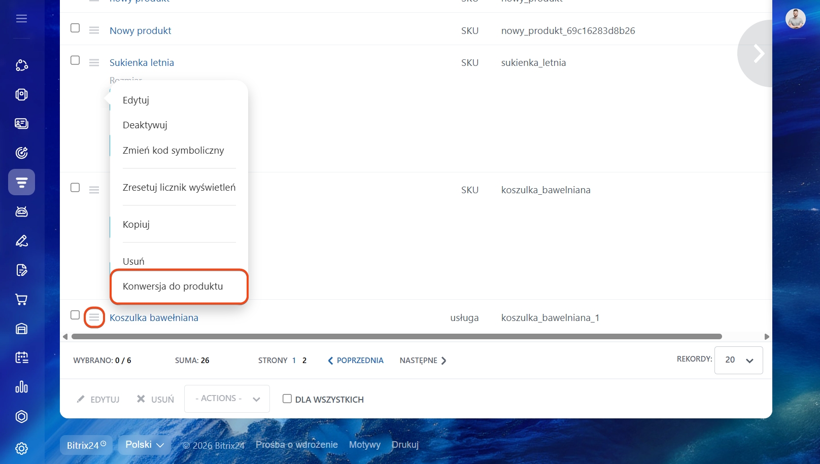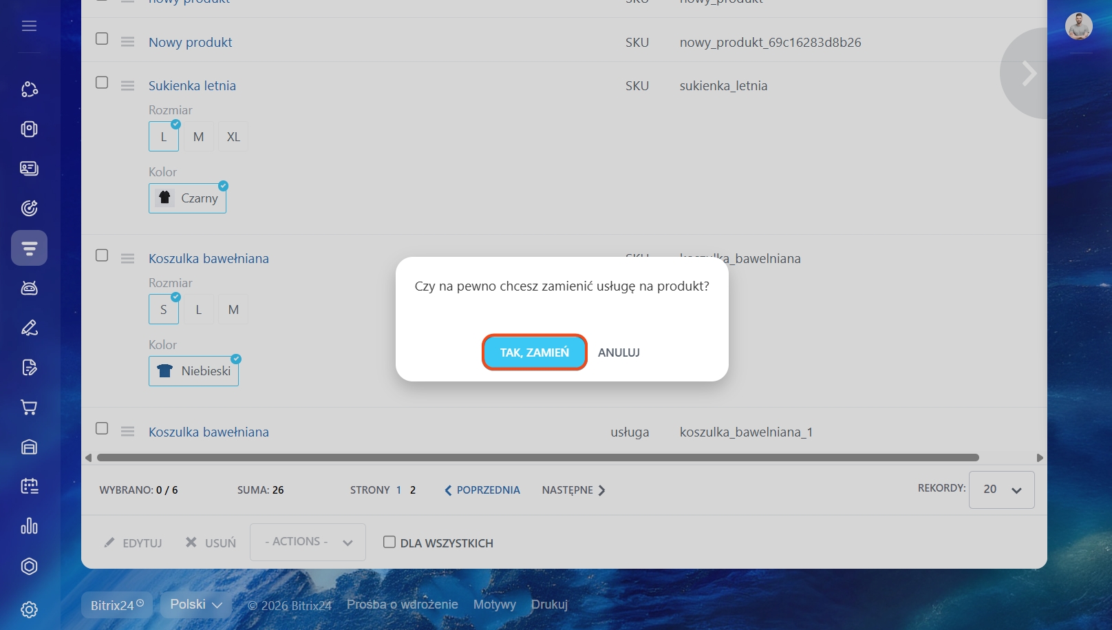 Domyślnie w Bitrix24 tworzony jest produkt z wariantami. Jeśli nie są one potrzebne, produkt można przekształcić w prosty. Są na to dwa sposoby: