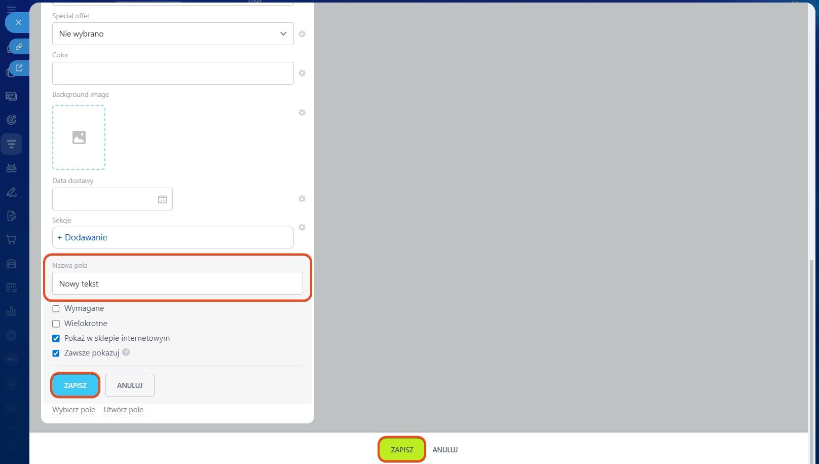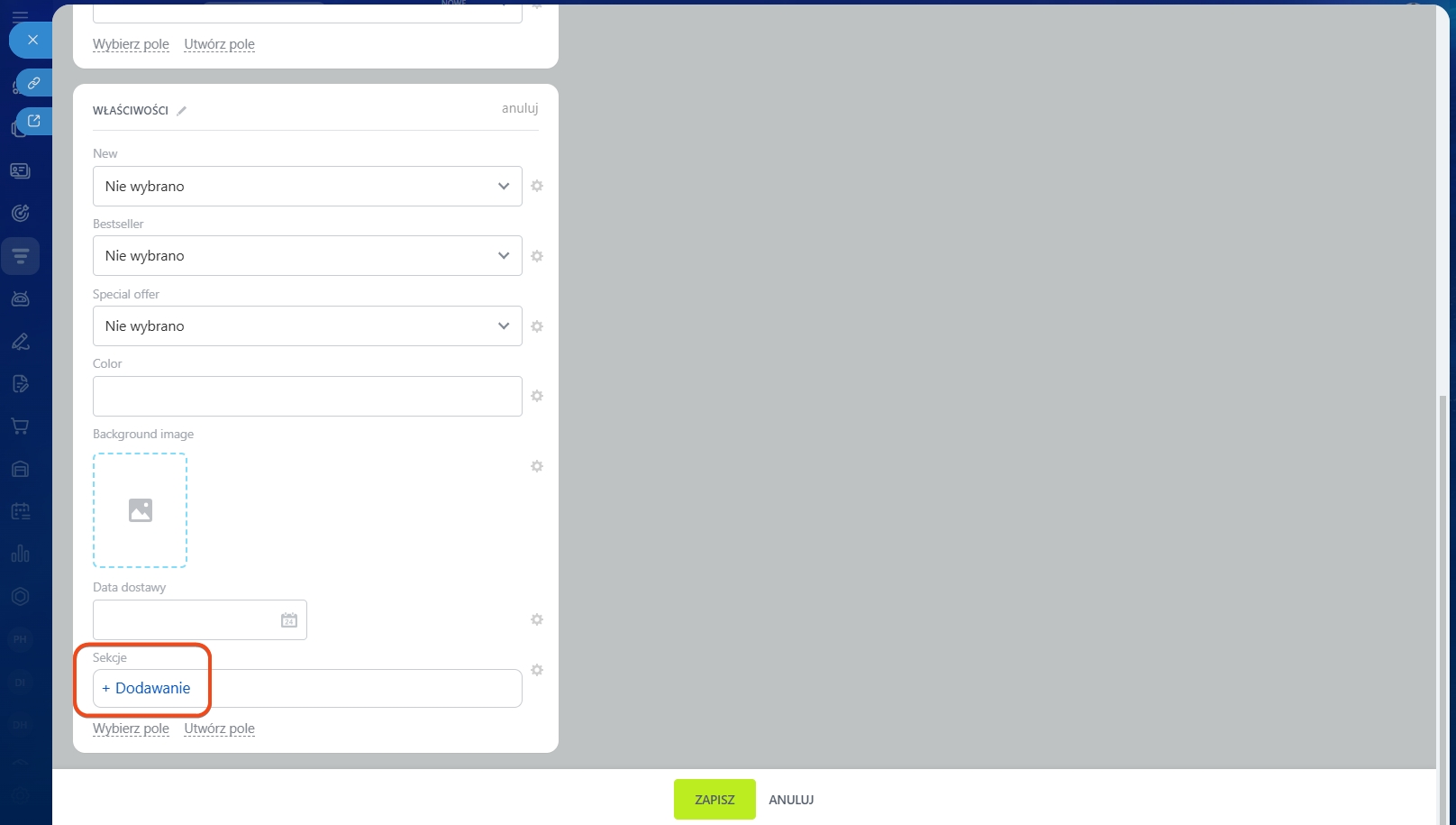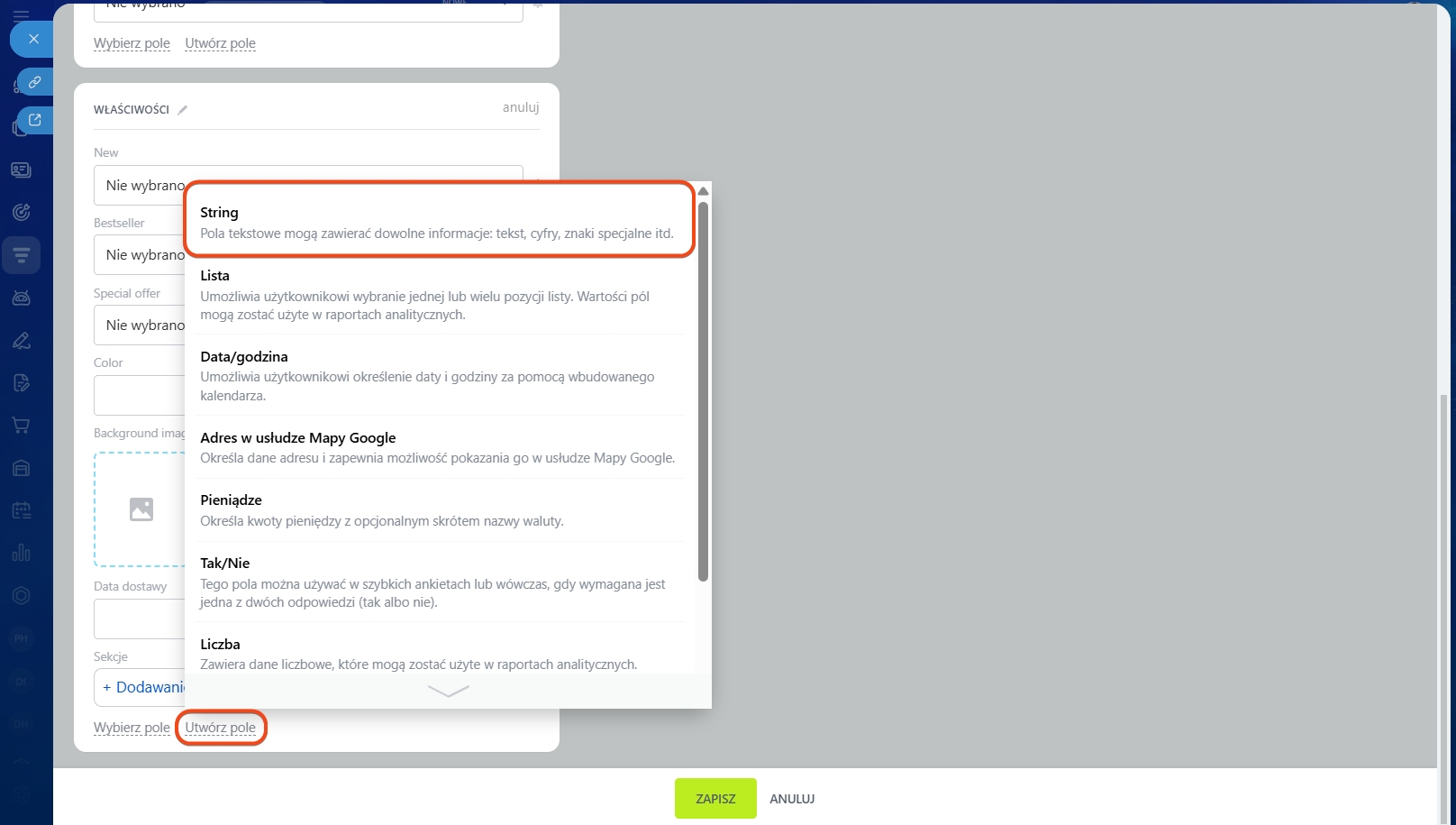 2. Jeśli standardowe cechy są niewystarczające, dodaj właściwości produktu — na przykład kolor, materiał lub producenta. W tym celu kliknij przycisk Utwórz pole i wybierz odpowiedni format danych. Wpisz nazwę właściwości i kliknij Zapisz.