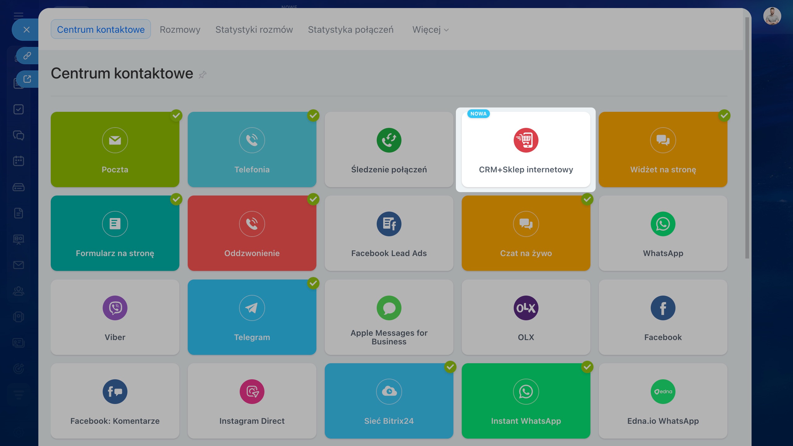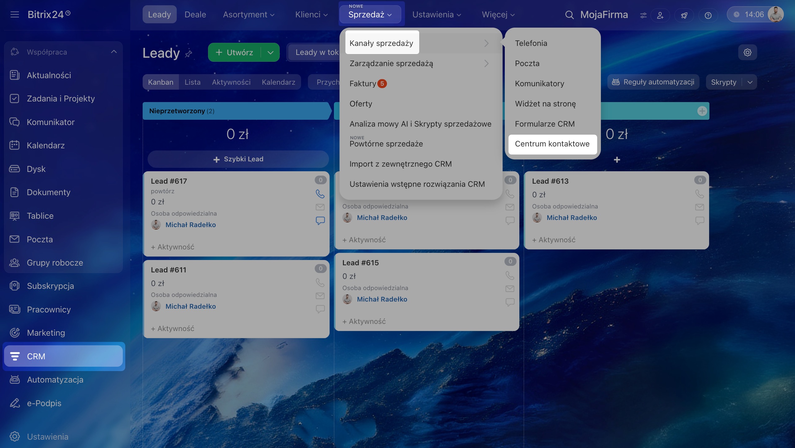 1–4. Przejdź do sekcji CRM > Sprzedaż > Kanały sprzedaży > Centrum kontaktowe.