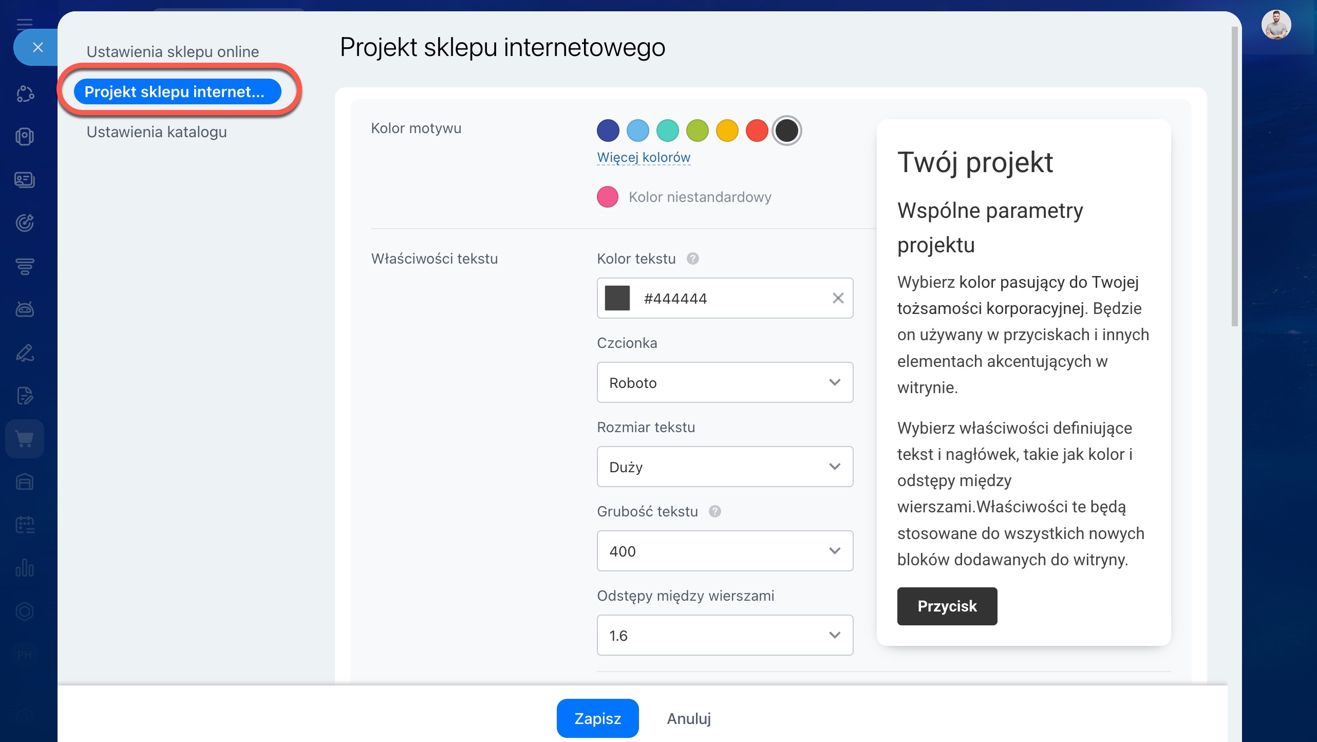 - W zakładce Projekt sklepu konfigurujesz wygląd strony.