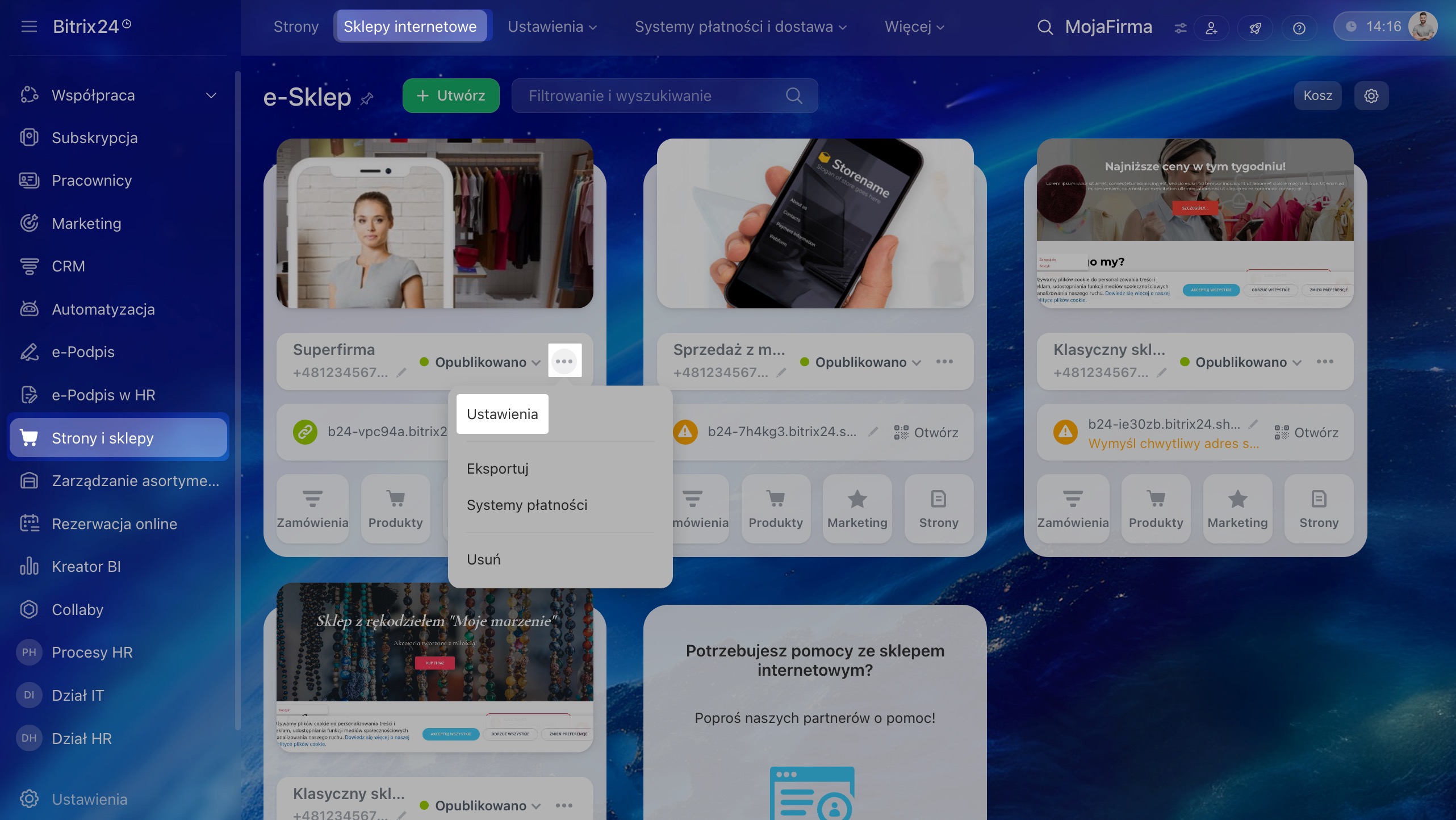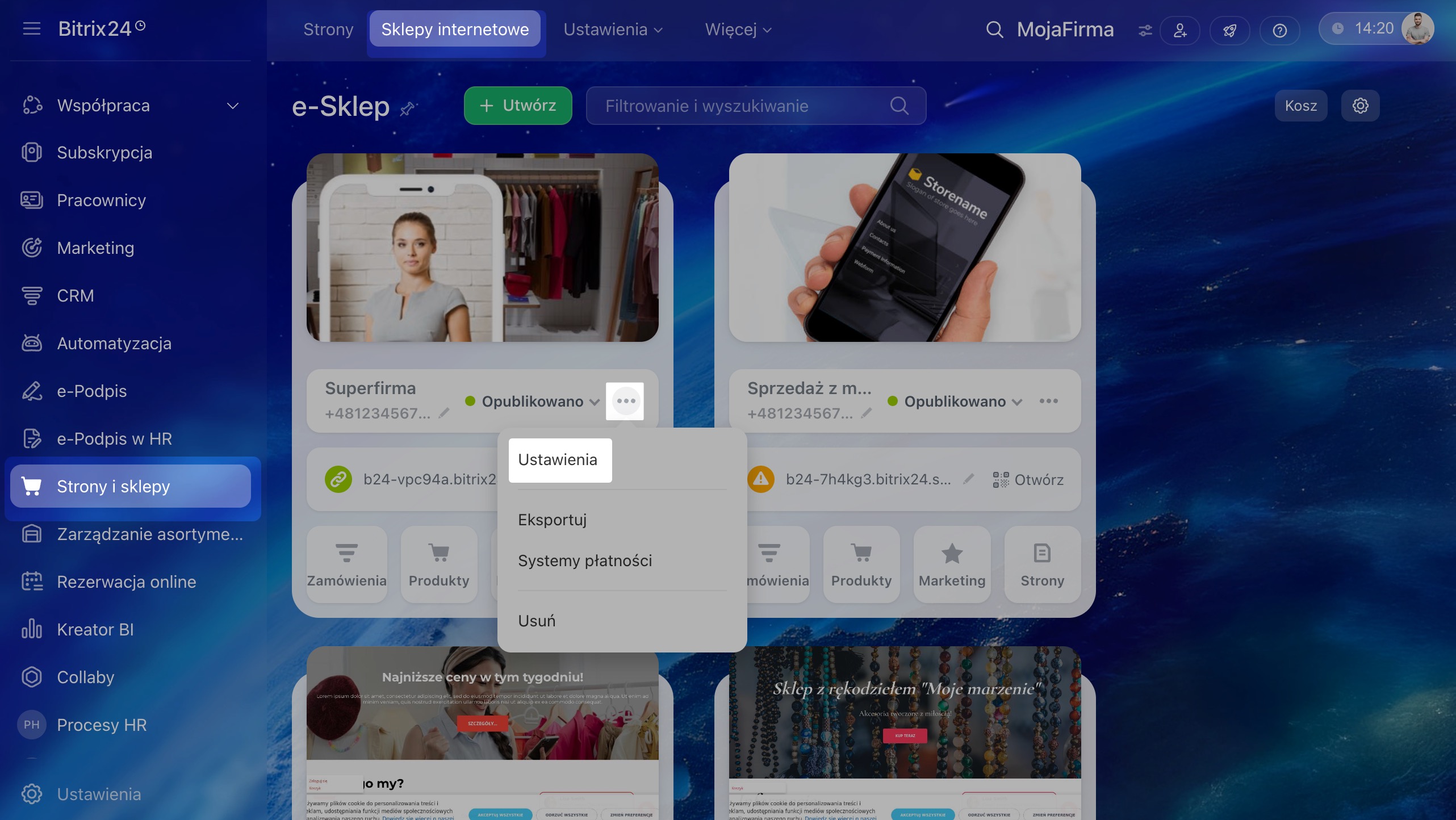 - Sklep tworzysz w kilka minut w sekcji CRM > Sprzedaż > Kanały sprzedaży > Centrum kontaktowe. Po utworzeniu możesz od razu go sprawdzić — złożyć testowe zamówienie.