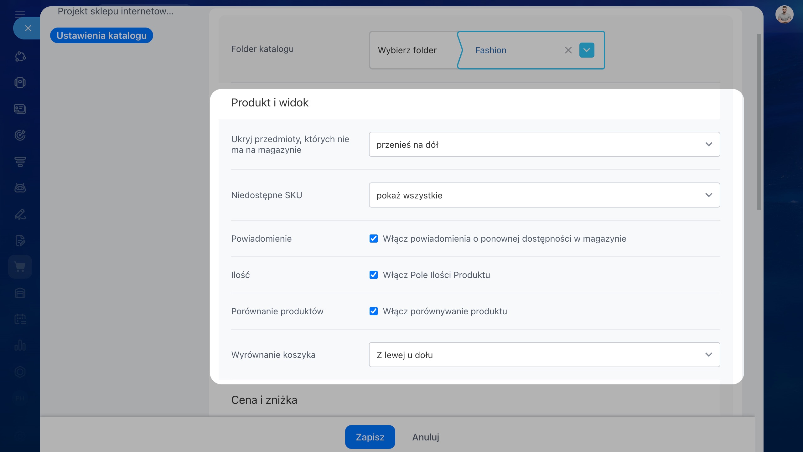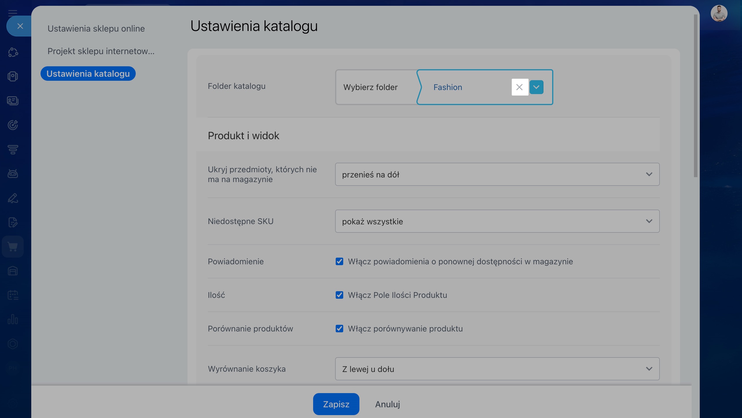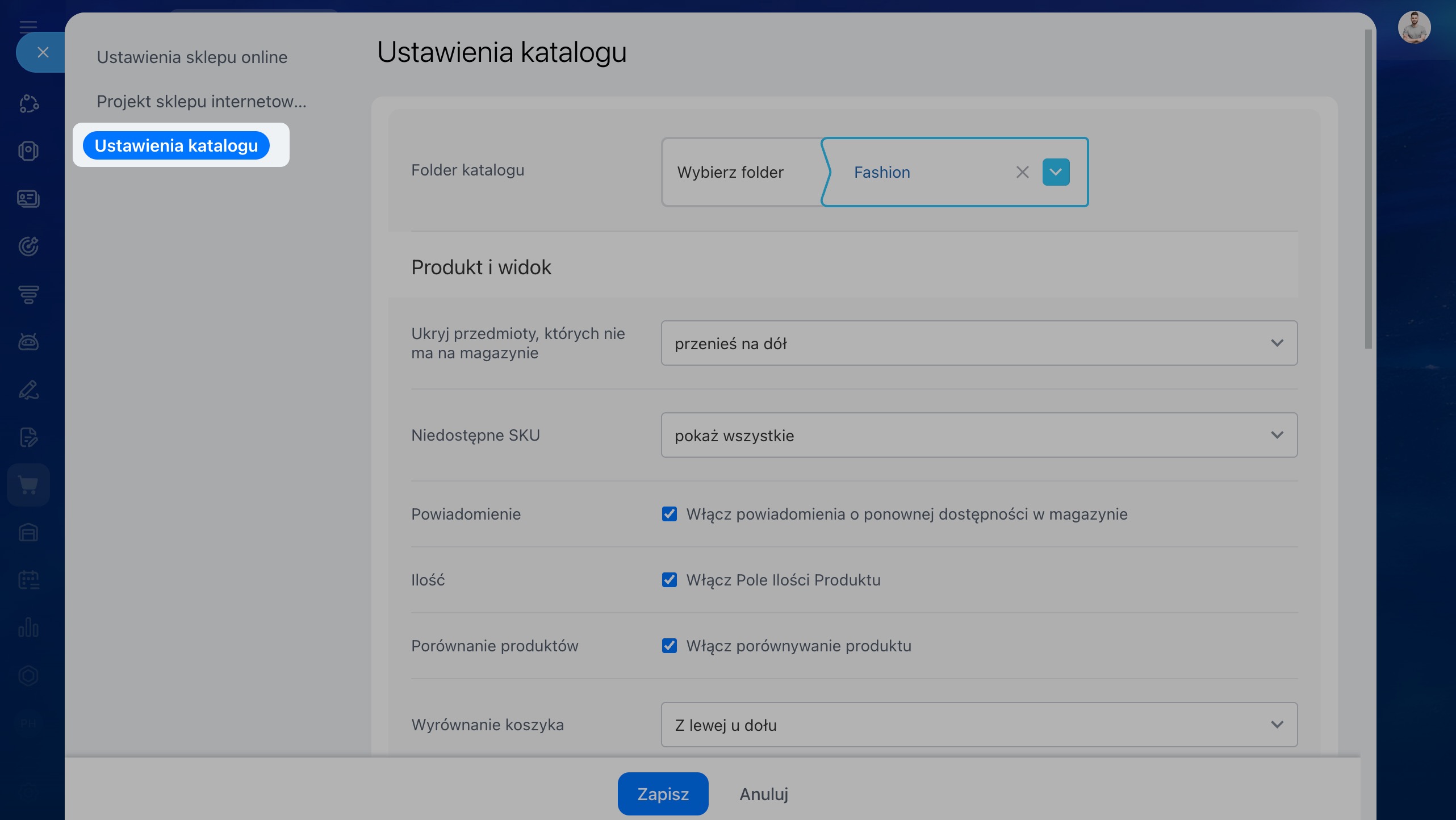 - W zakładce Ustawienia katalogu wybierasz, jakie produkty pokazywać w sklepie, jak się wyświetlają i inne.