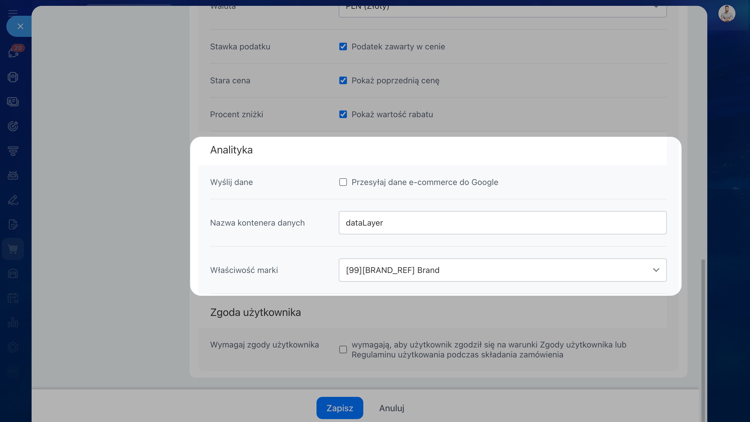 Sales Intelligence. Te ustawienia pomagają przekazywać dane o zamówieniach i zachowaniu klientów do systemów analitycznych Google.