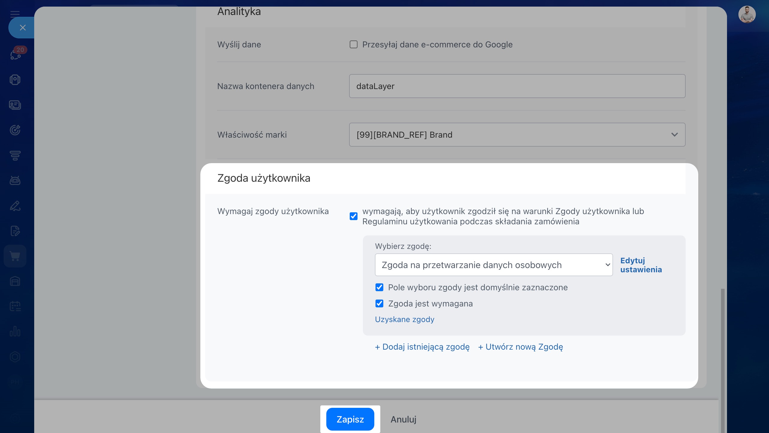 1. Włącz wyświetlanie zgody przy składaniu zamówienia.