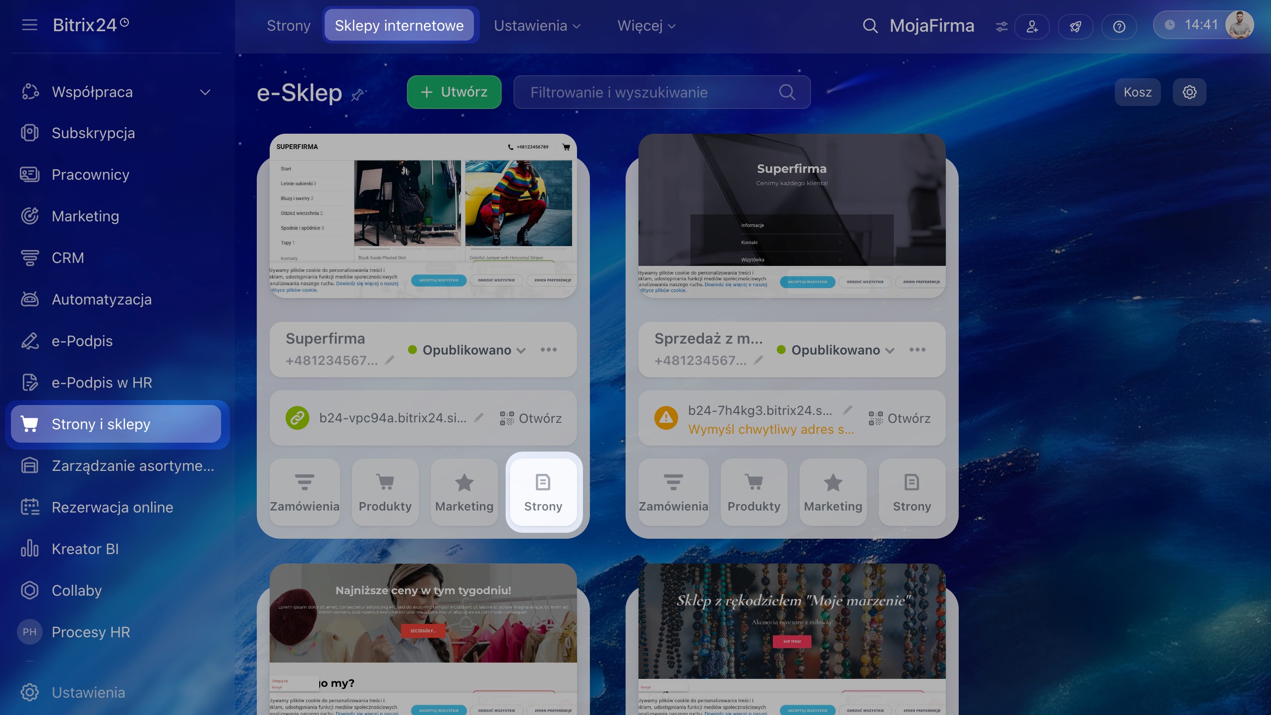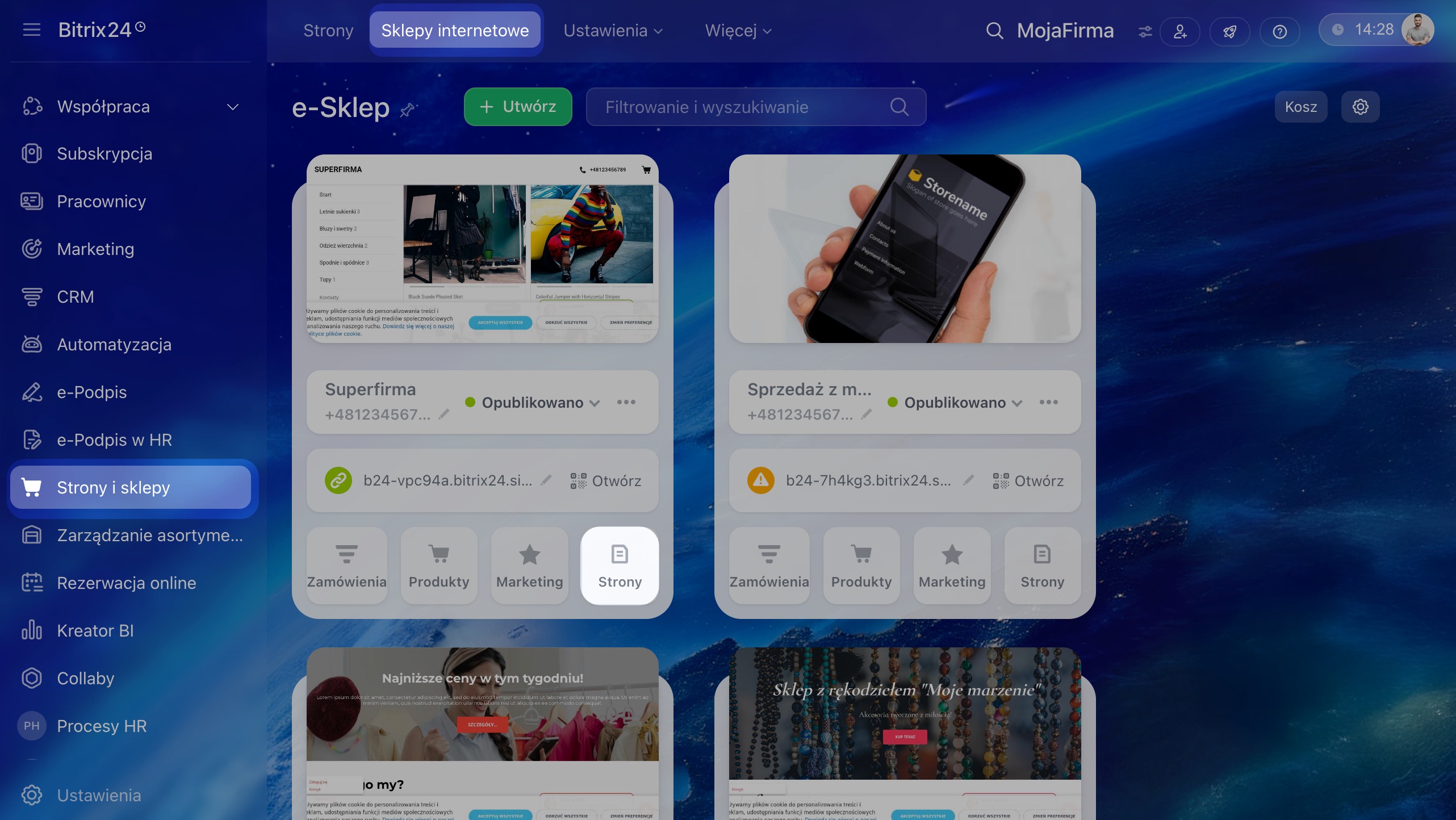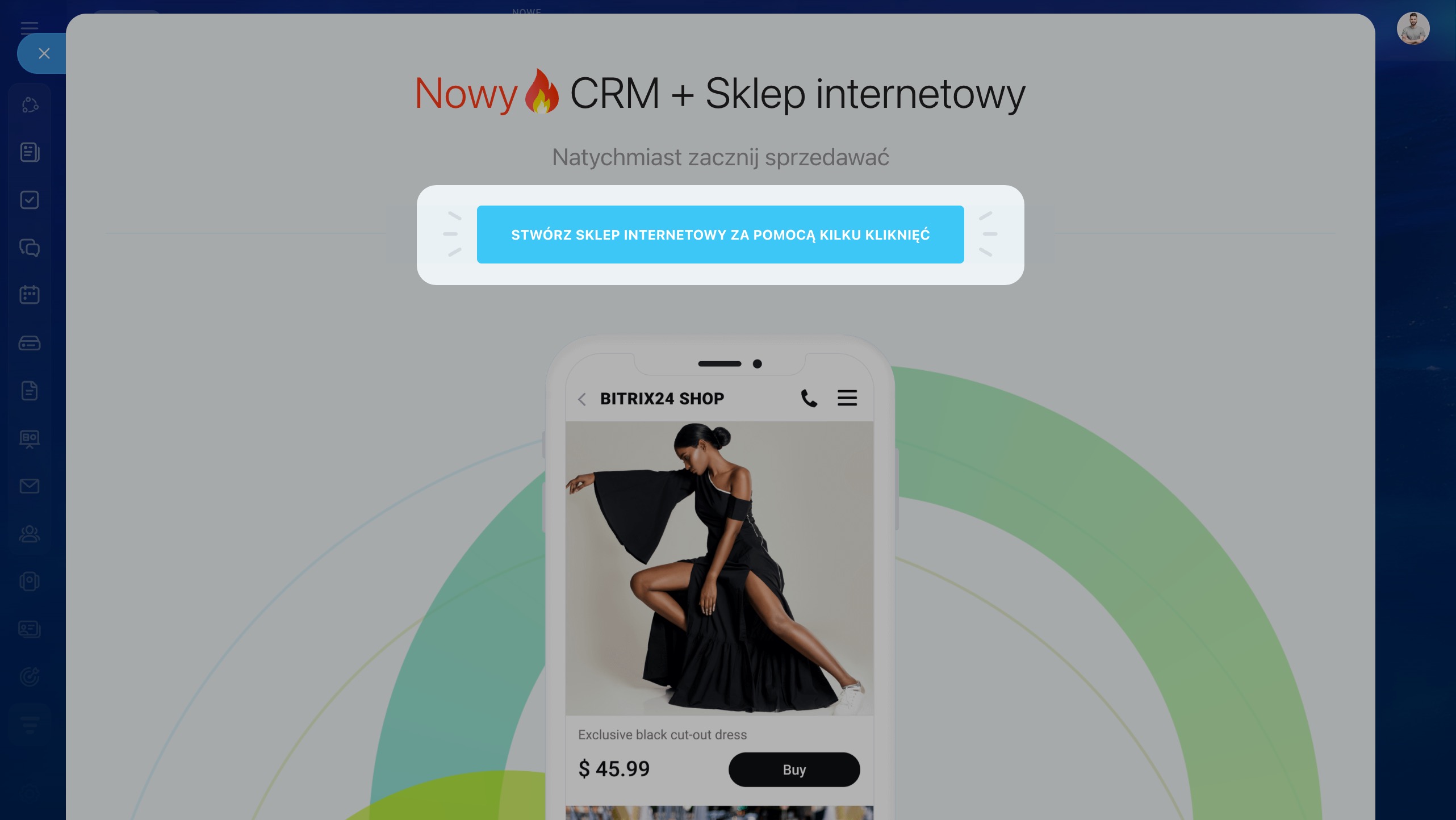 CRM + Sklep internetowy mogą utworzyć administrator Bitrix24 oraz pracownicy z uprawnieniami dostępu do przeglądania i tworzenia stron oraz sklepów.