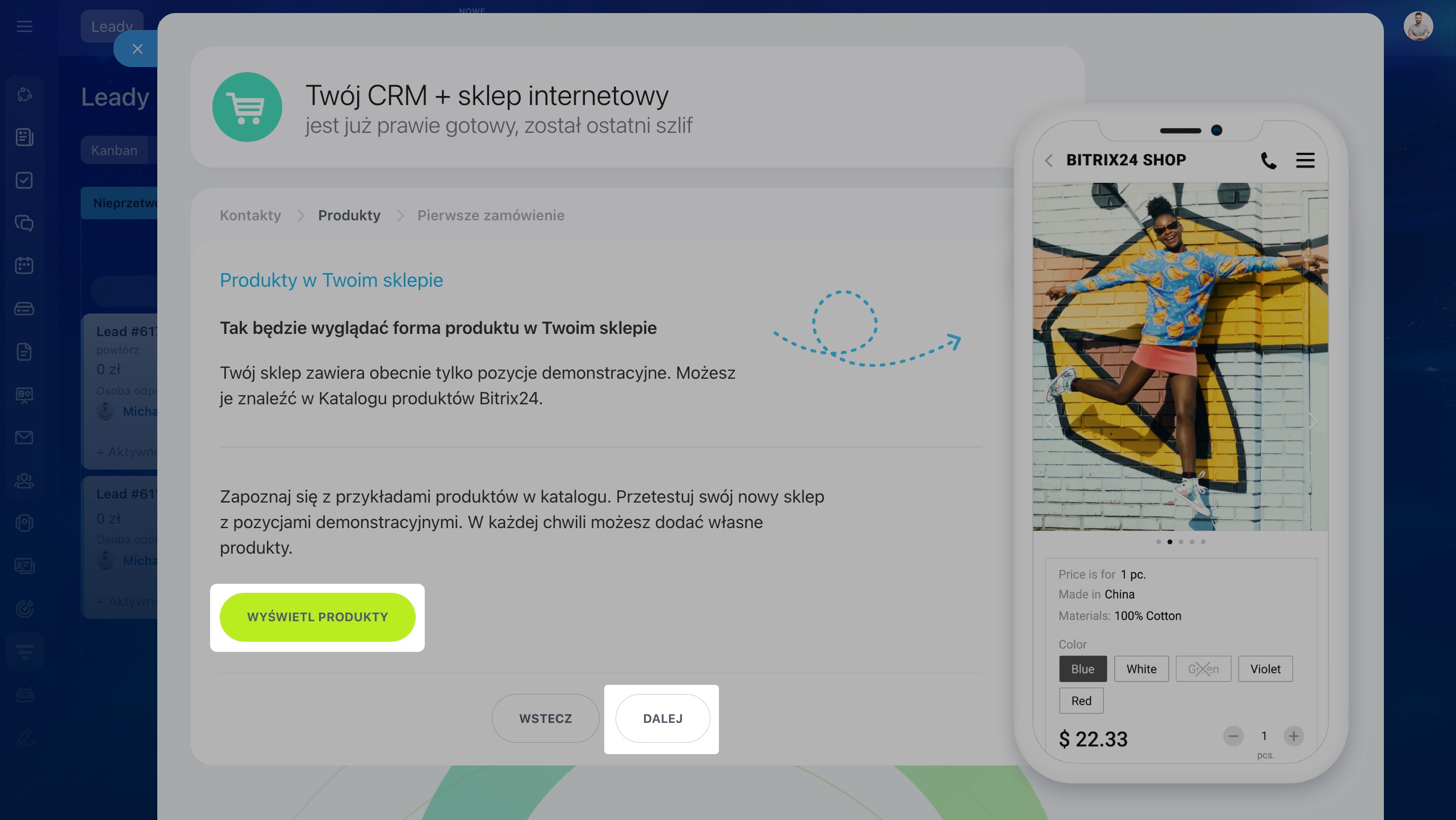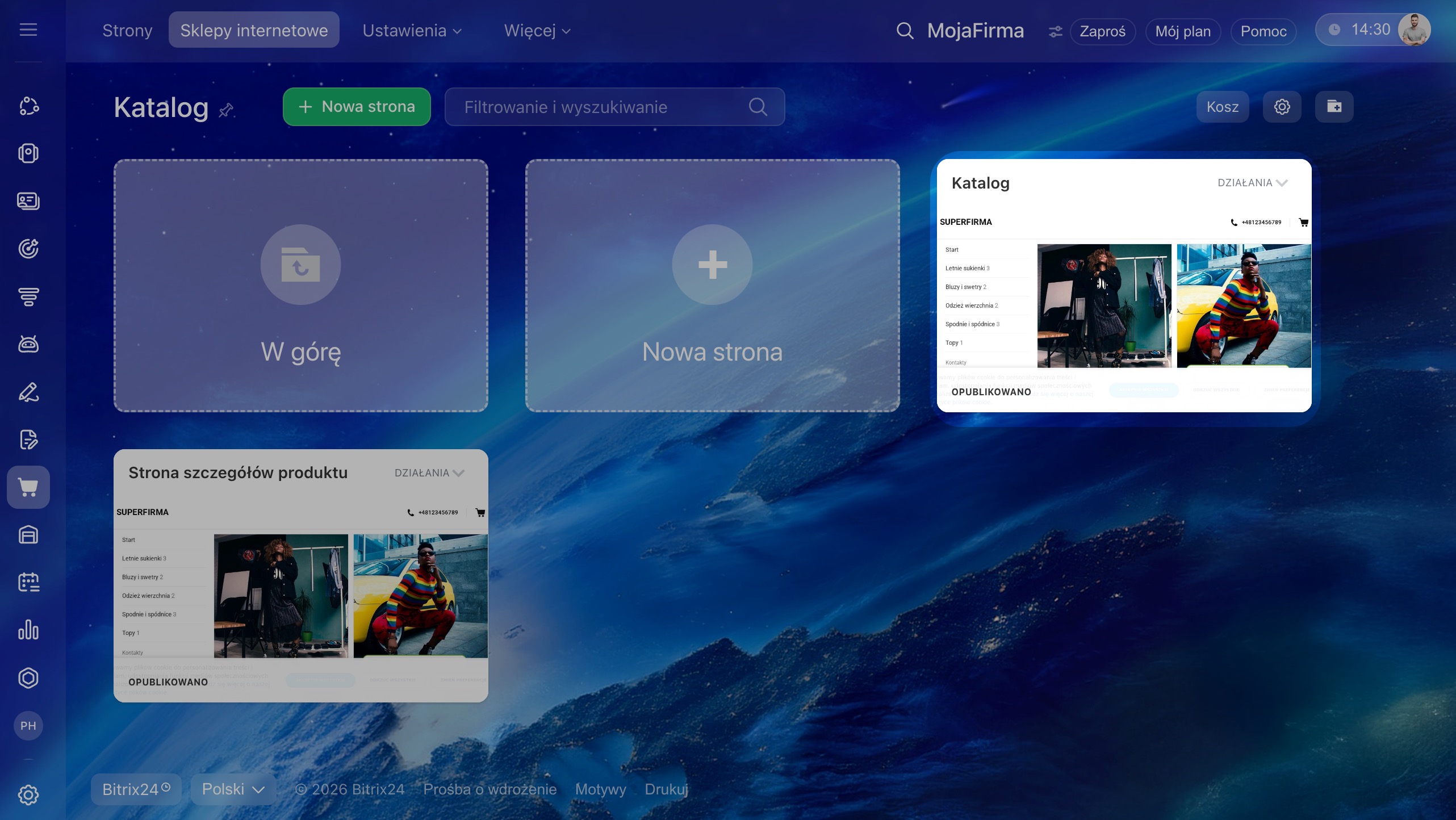 Utworzenie CRM + Sklep internetowy zajmuje kilka minut. Bitrix24 automatycznie stworzy stronę z gotową strukturą i demo-produktami — można ją od razu otworzyć i sprawdzić, jak klienci składają zamówienia.