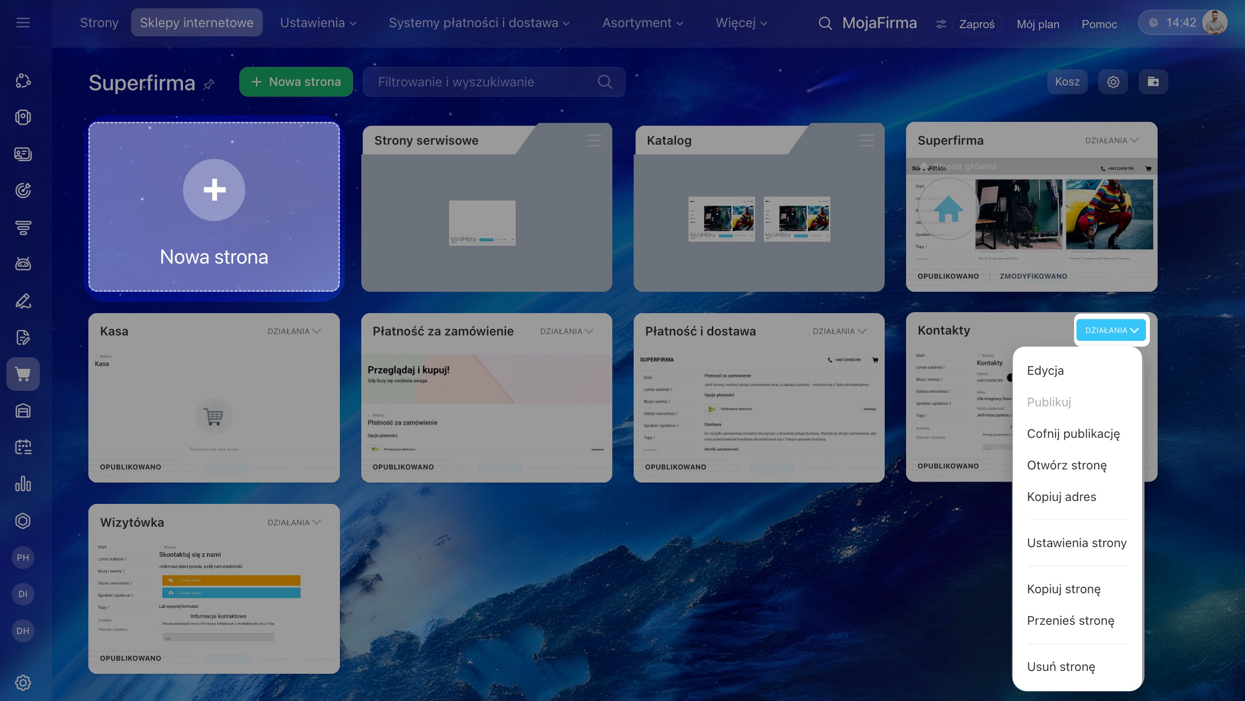 Strona to oddzielna sekcja witryny sklepu, na przykład katalog, formularz elementu CRM produktu, składanie zamówienia i inne sekcje strony. Strony można edytować — zmienić projekt, dodać lub usunąć bloki i tak dalej.