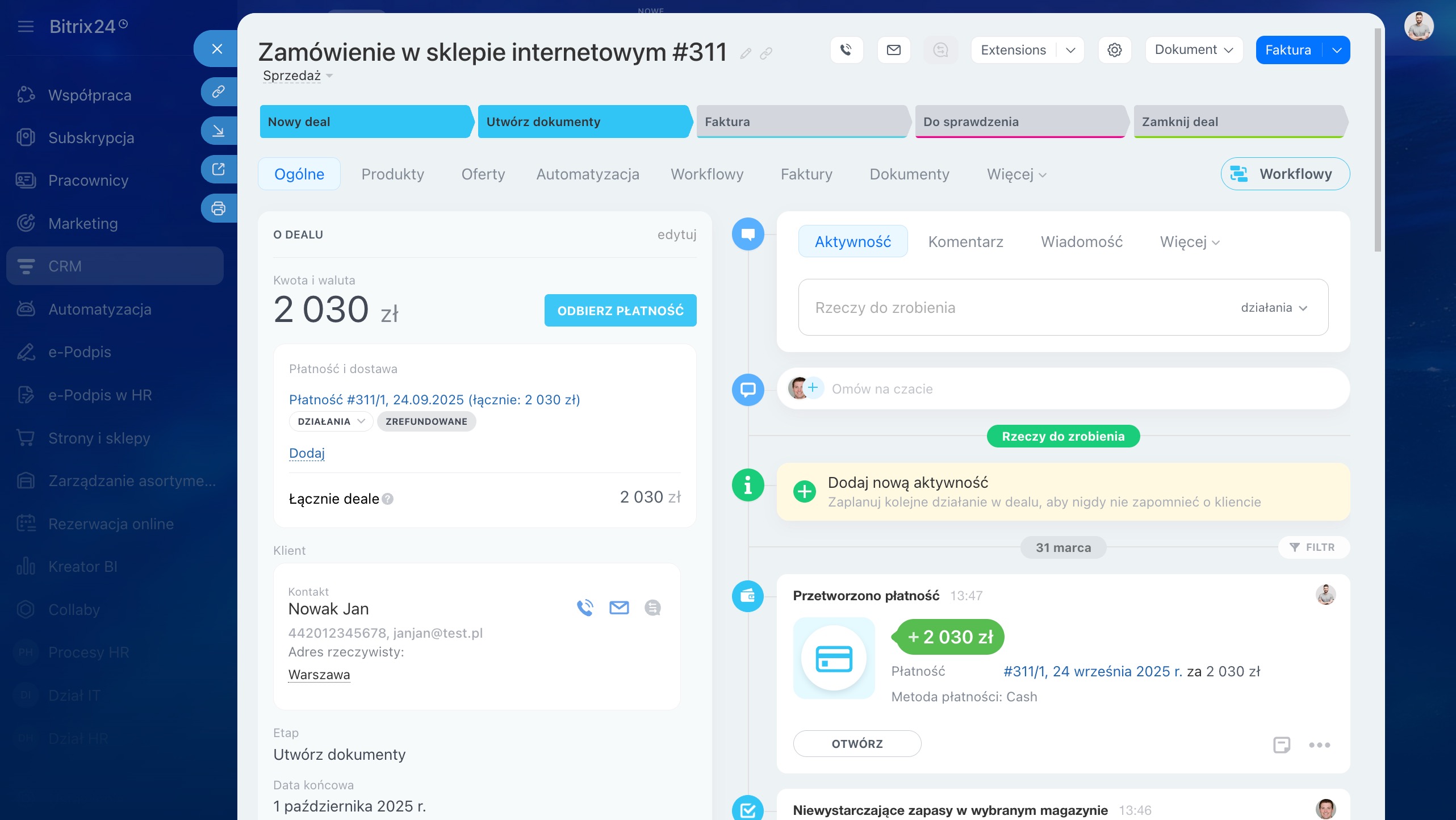 - w CRM automatycznie tworzony jest deal z produktami, kwotą i danymi kontaktowymi klienta,