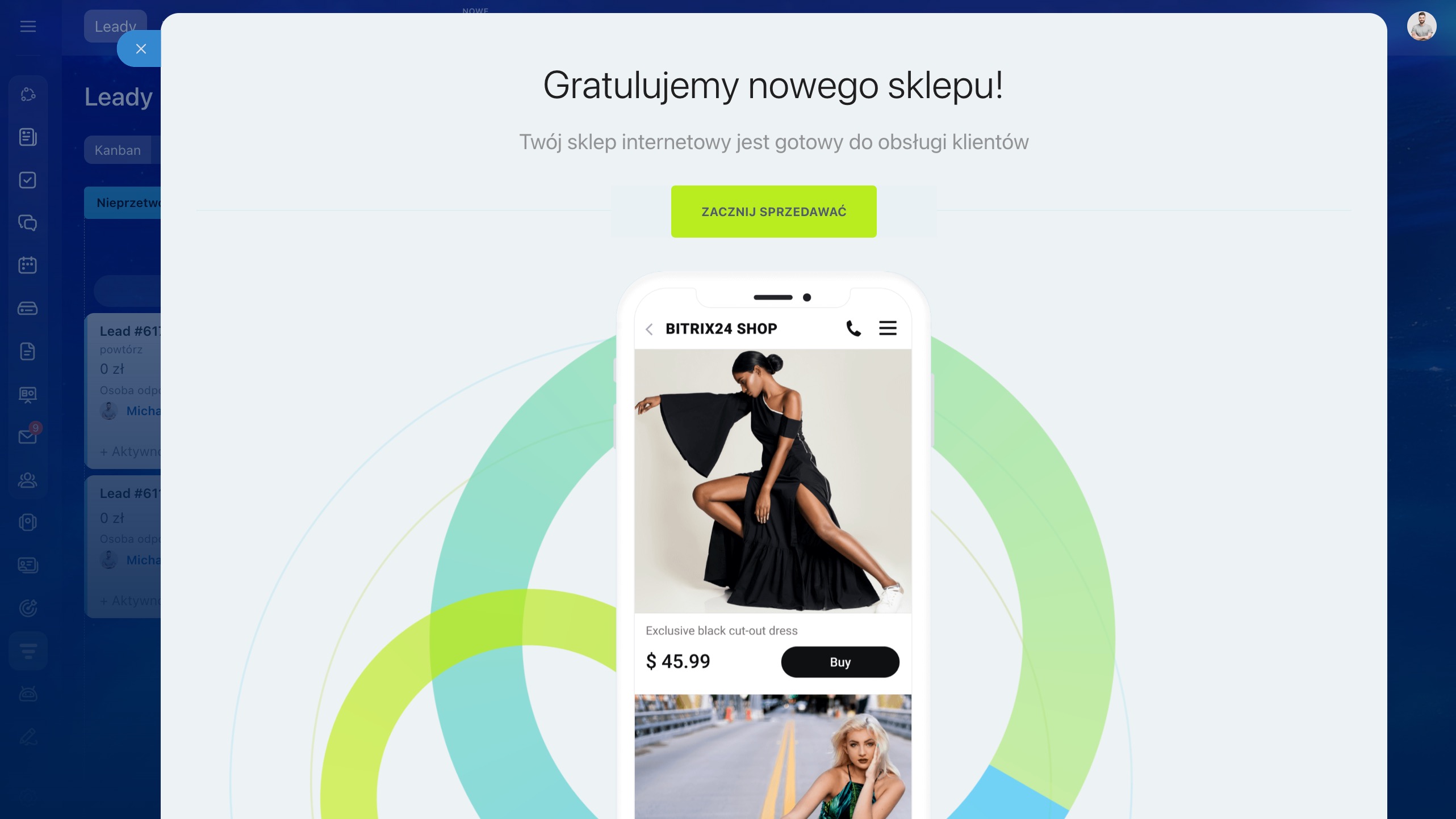 CRM + Sklep internetowy w Bitrix24 to gotowa strona z katalogiem produktów i możliwością przyjmowania zamówień, od razu połączona z CRM. Sprzedaż online można uruchomić bez tworzenia strony od zera. Sklep jest dostosowany do urządzeń mobilnych.