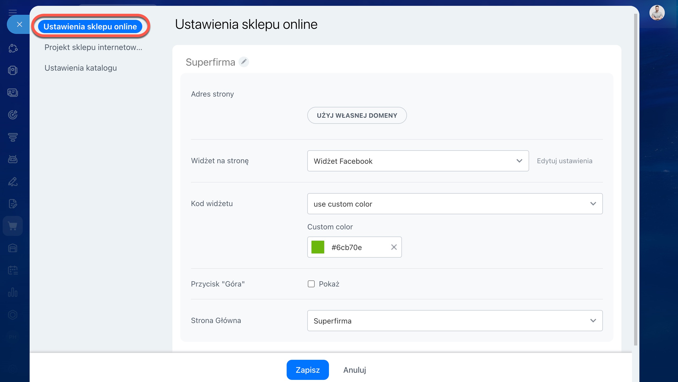 - W zakładce Ustawienia sklepu zmieniasz domenę, stronę główną, widget do kontaktu z klientami i inne elementy.