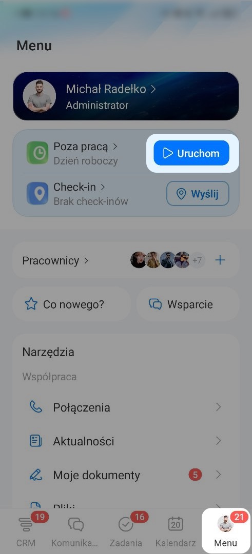 Na dole ekranu otwórz sekcję Menu i w bloku Dzień pracy kliknij Rozpocznij.