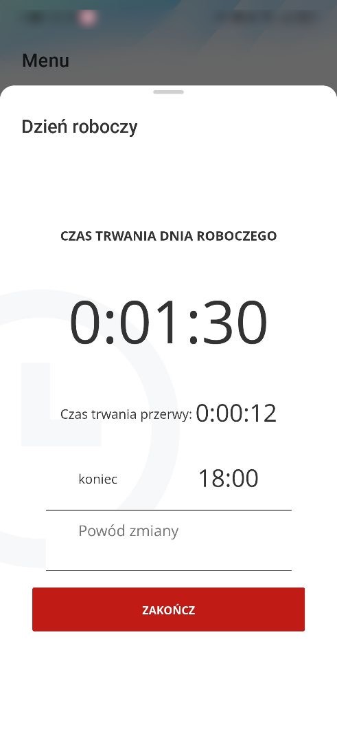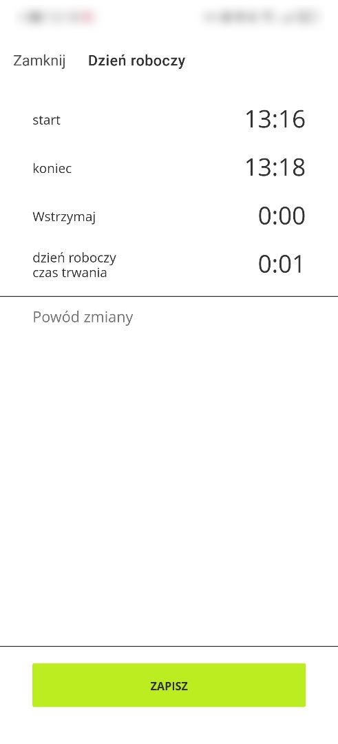 Zmienić dzień pracy — skoryguj czas rozpoczęcia, przerwy lub zakończenia dnia pracy. Użyj tej opcji, jeśli chcesz wprowadzić kilka zmian lub edytować już zakończony dzień. Po tej operacji informacje trafią do przełożonego do zatwierdzenia.