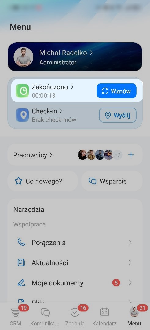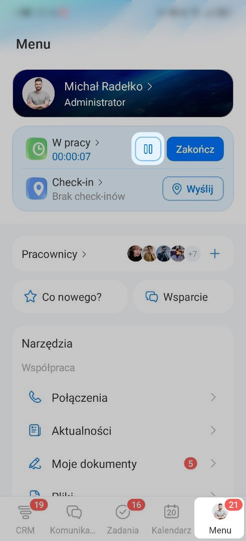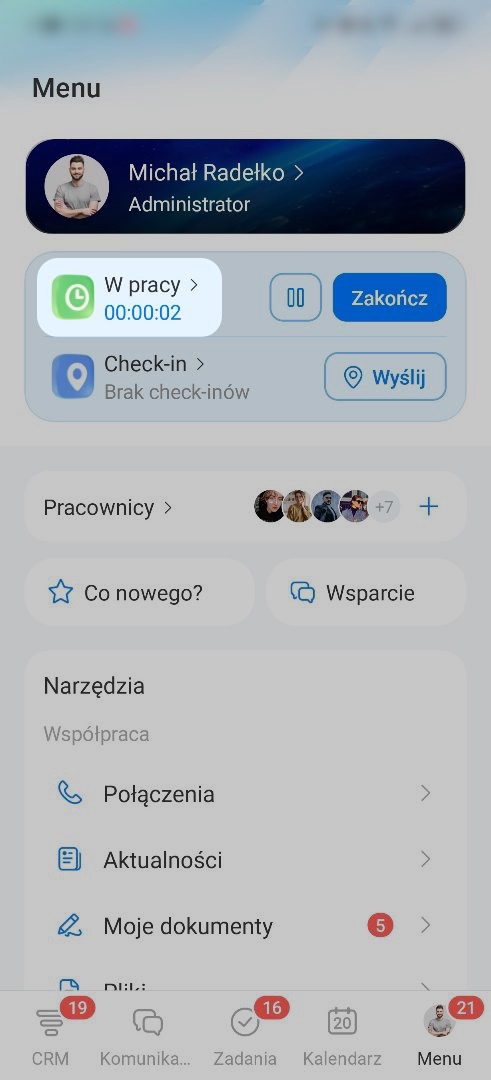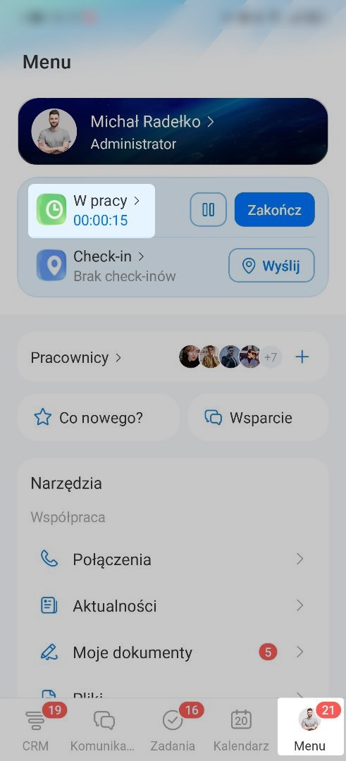 W aplikacji mobilnej Bitrix24 możesz oznaczyć początek dnia pracy, wstrzymać go i zakończyć pracę. Dzięki temu widzisz podsumowanie dnia roboczego i śledzisz czas.