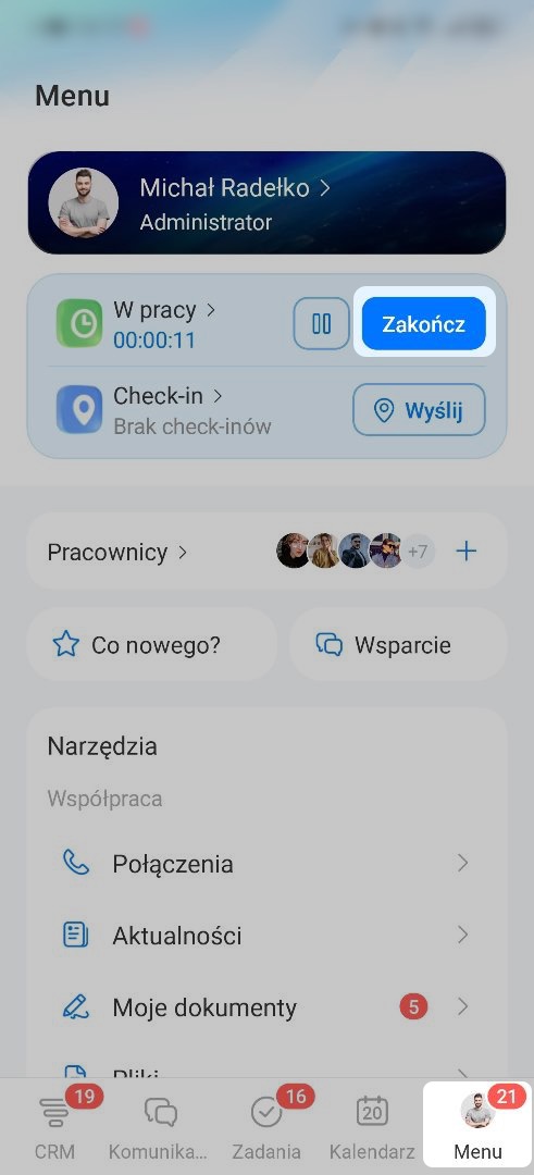 Na dole ekranu otwórz sekcję Menu i w bloku Dzień pracy kliknij Zakończ.