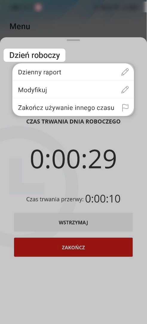 Jeśli nie udało Ci się na czas oznaczyć początku dnia pracy, przerwy lub zakończenia pracy, czas możesz skorygować później. Przejdź do sekcji Menu > Dzień pracy.