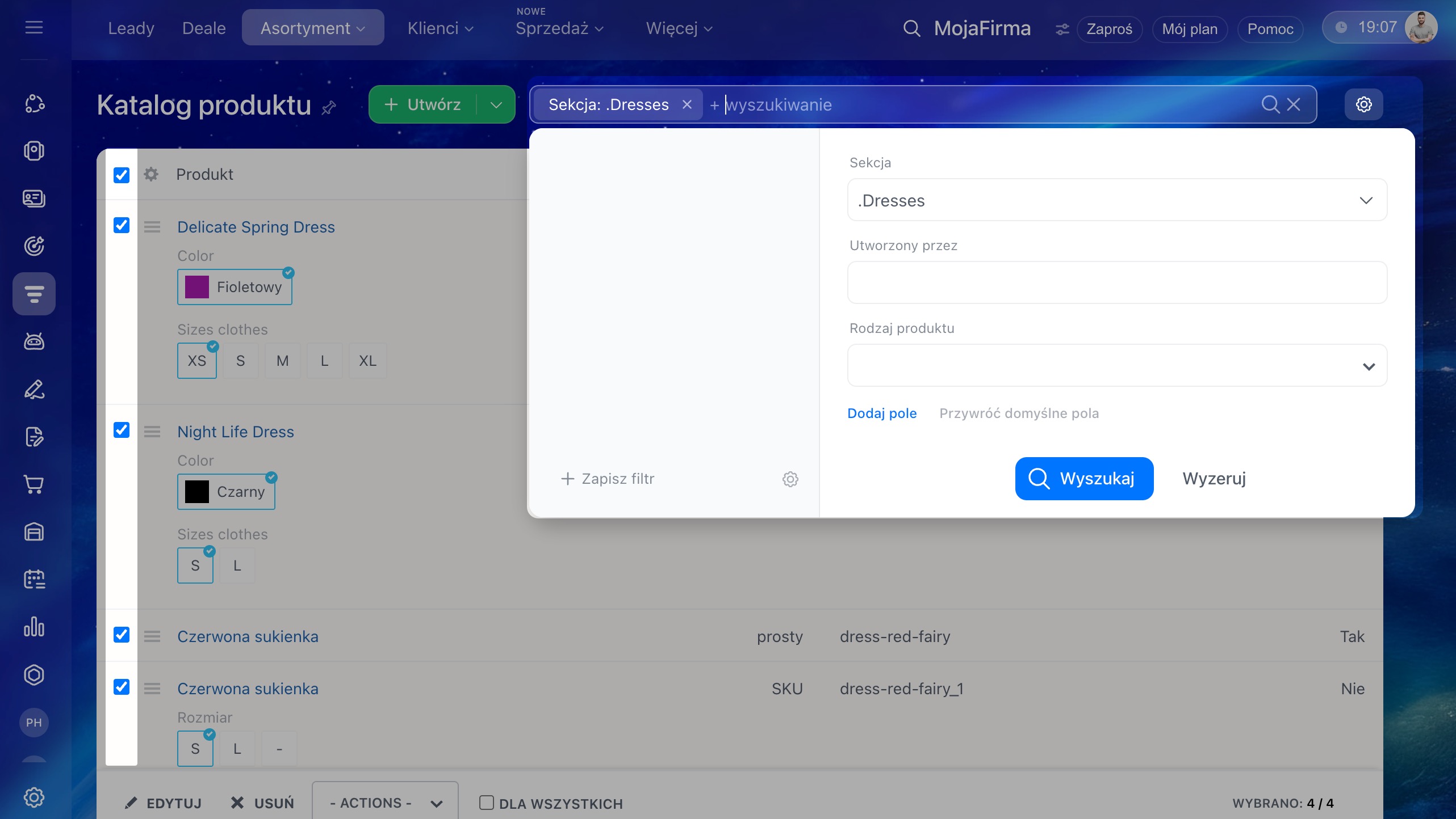 - Przy masowej edycji: otwórz katalog produktów → zaznacz pozycje (lub użyj filtra „Dla wszystkich”) → kliknij Działania → wybierz działanie → ustaw parametry → Zapisz.