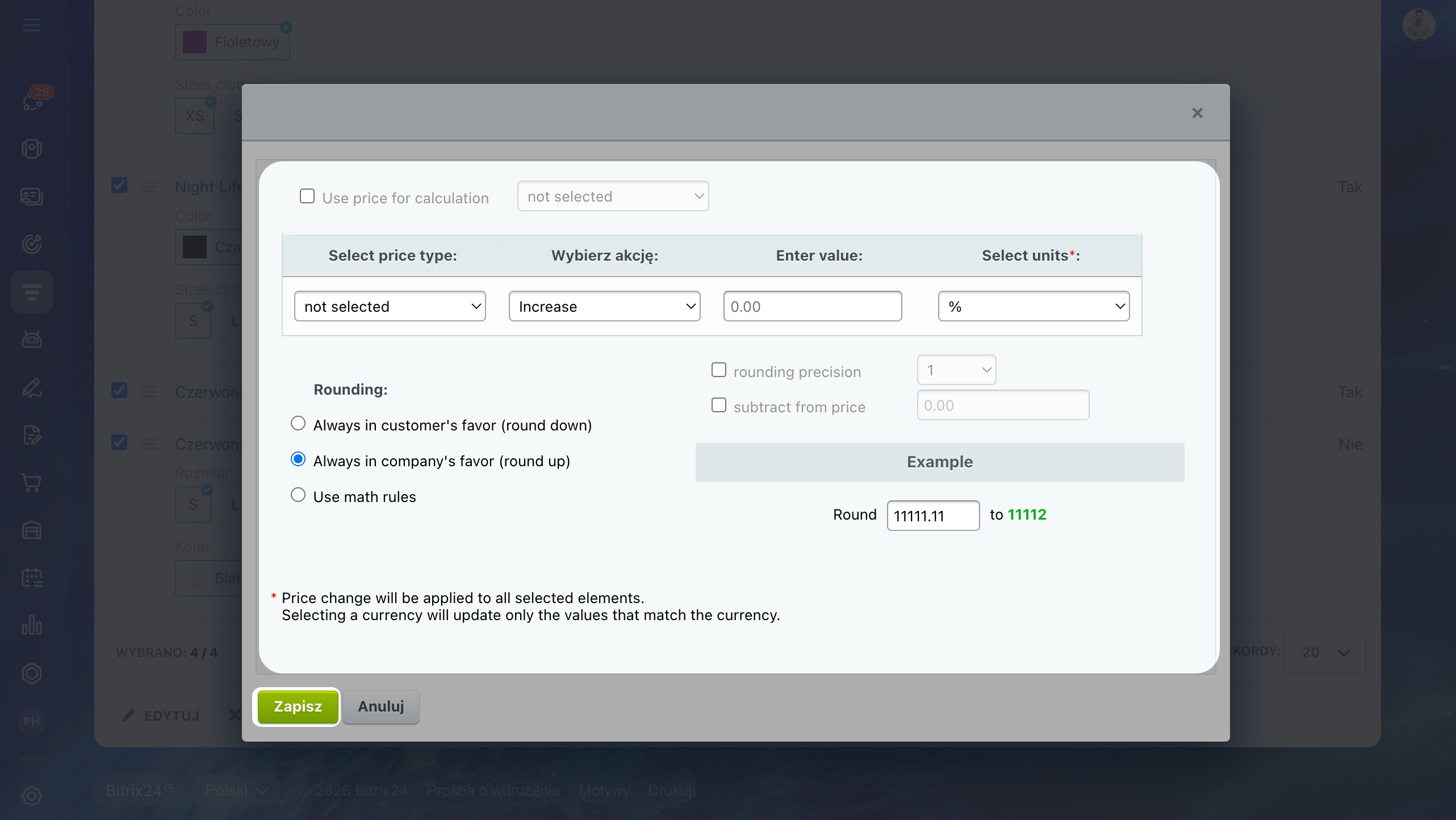 - Zmień ceny – zwiększa lub zmniejsza cenę wybranych produktów. Możesz ustawić zmianę procentową lub kwotową oraz skonfigurować zaokrąglenie.