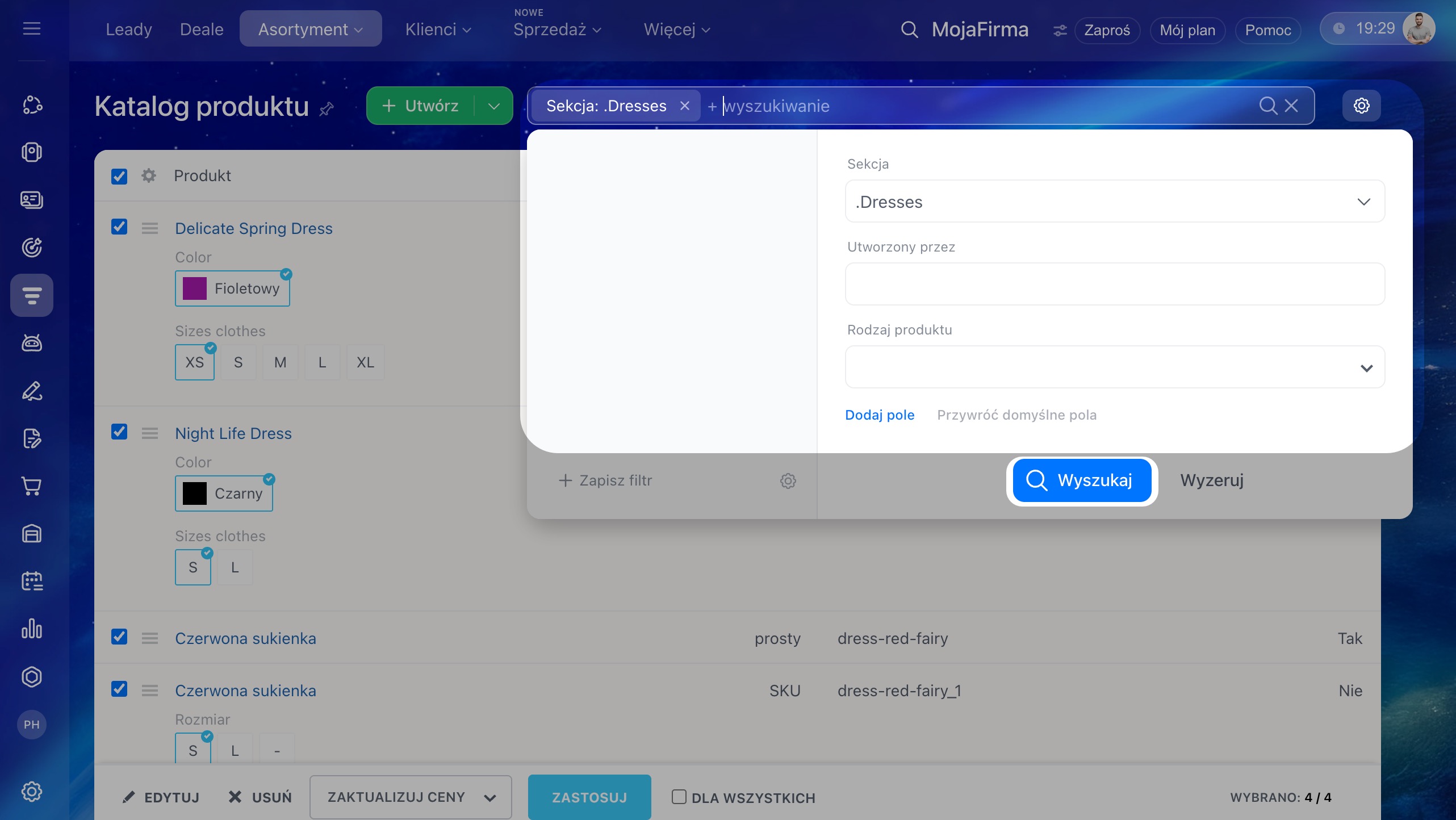 Masowe działania umożliwiają szybką zmianę wielu produktów jednocześnie. Są szczególnie przydatne, gdy dla wszystkich wybranych pozycji trzeba wykonać tę samą operację – na przykład podnieść cenę o 10% w całej kategorii lub wyłączyć wszystkie produkty, których nie ma na stanie.