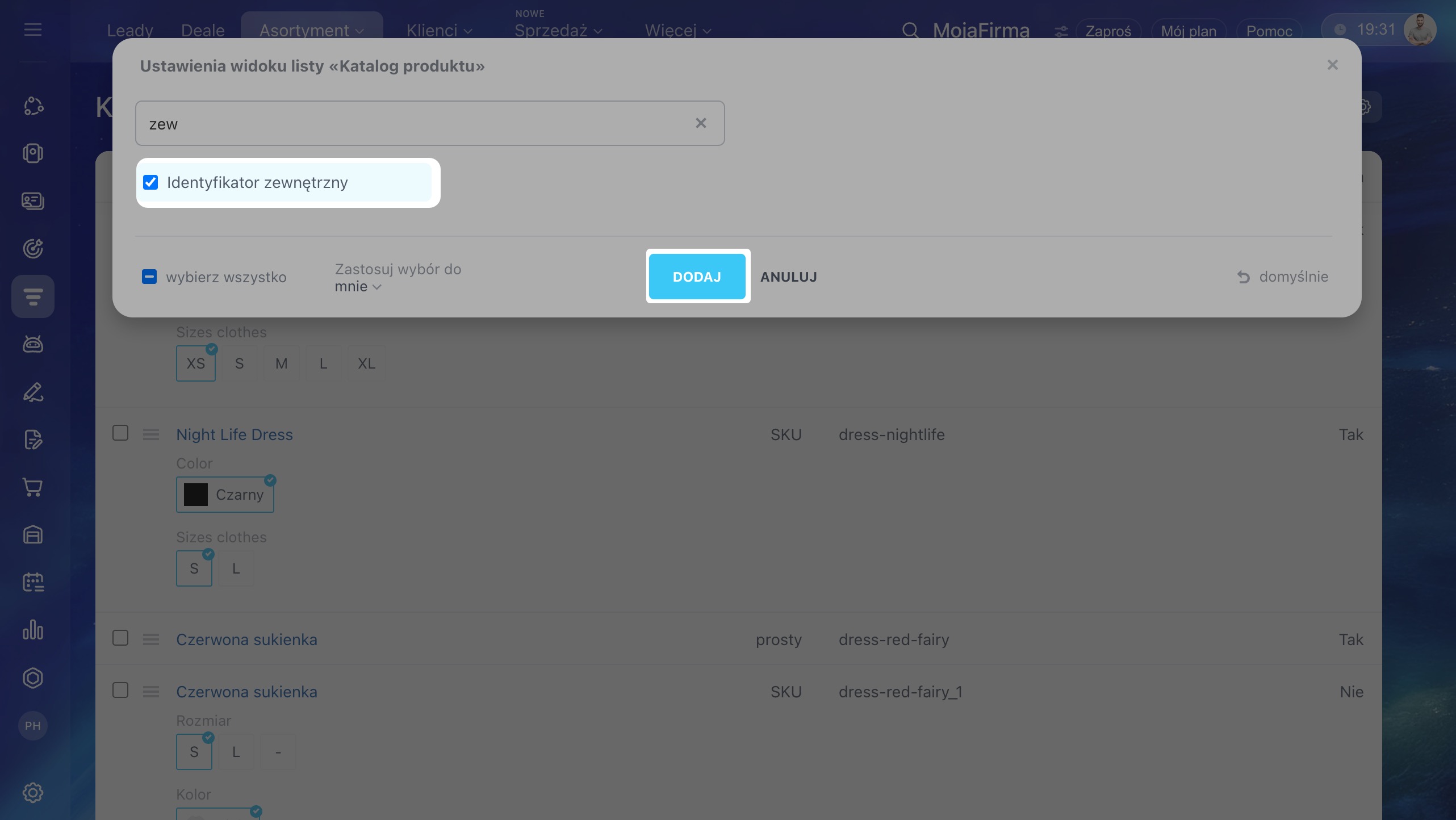 Aby plik zawierał tylko niezbędne dane, możesz wyeksportować wyłącznie wybrane pola (np. Produkt, Kod zewnętrzny i Cena). Kliknij Zastosuj.