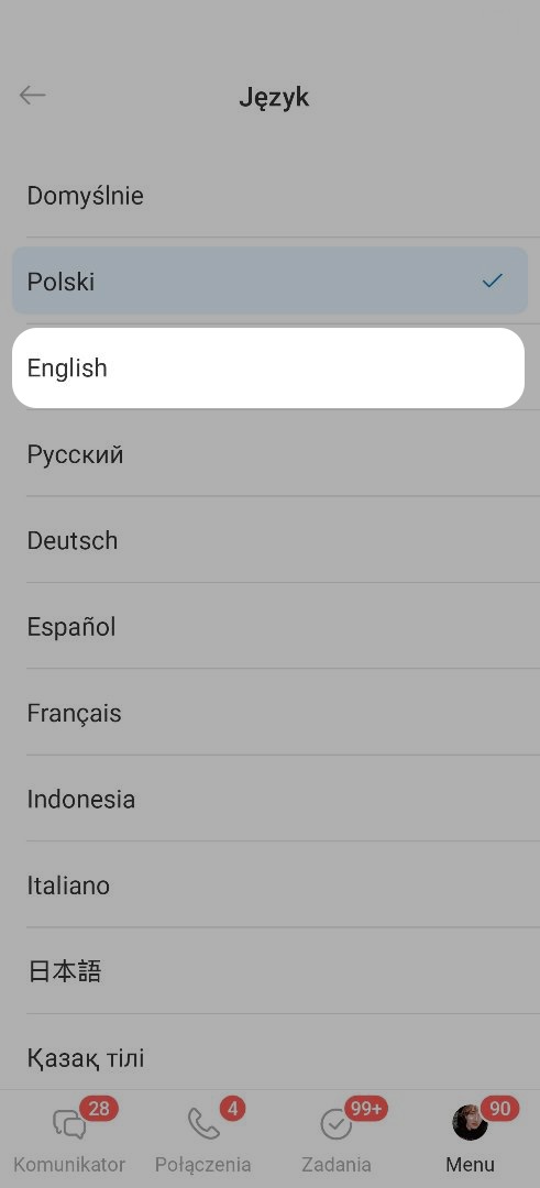Domyślnie aplikacja mobilna Bitrix24 używa języka urządzenia. Jeśli na telefonie ustawiono język rosyjski, interfejs aplikacji również będzie w tym języku.