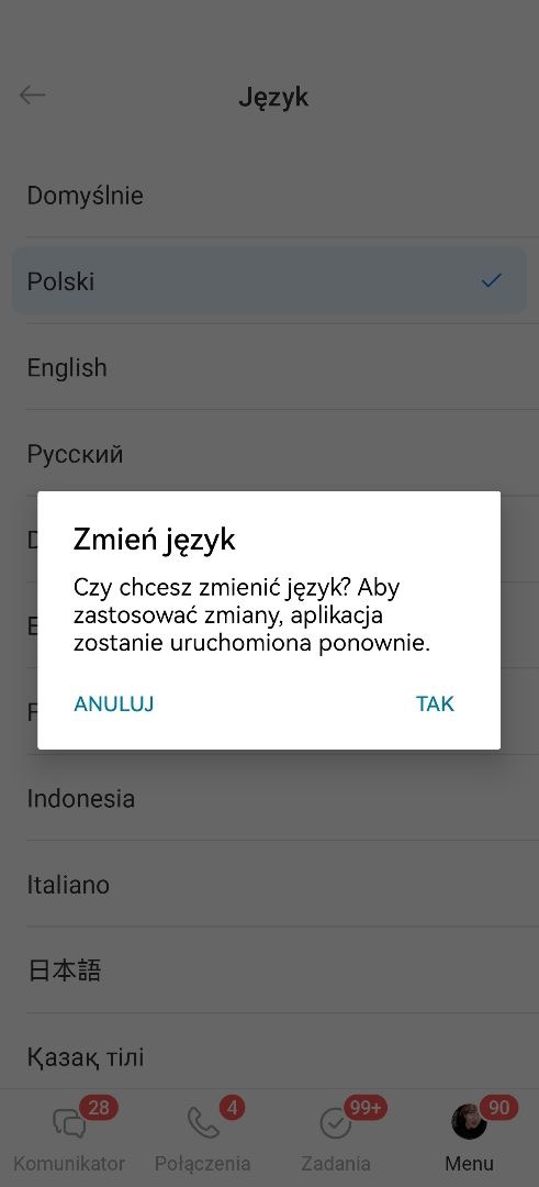 Kliknij Tak, aby potwierdzić działanie. Następnie aplikacja automatycznie uruchomi się ponownie i zastosuje wybrany język.